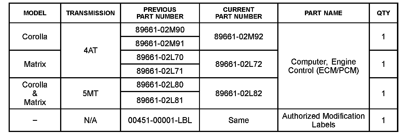 Under certain driving conditions some 2009 model year Corolla and Matrix vehicles may exhibit engine oil consumption. The Engine Control Module/ECM (SAE term: Powertrain Control Module/PCM) logic has been modified to improve this condition. Use the following repair procedure to address customer concerns.