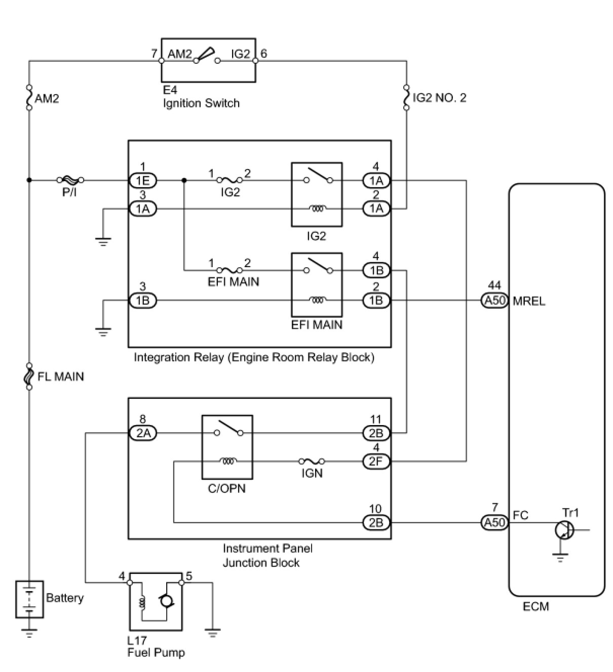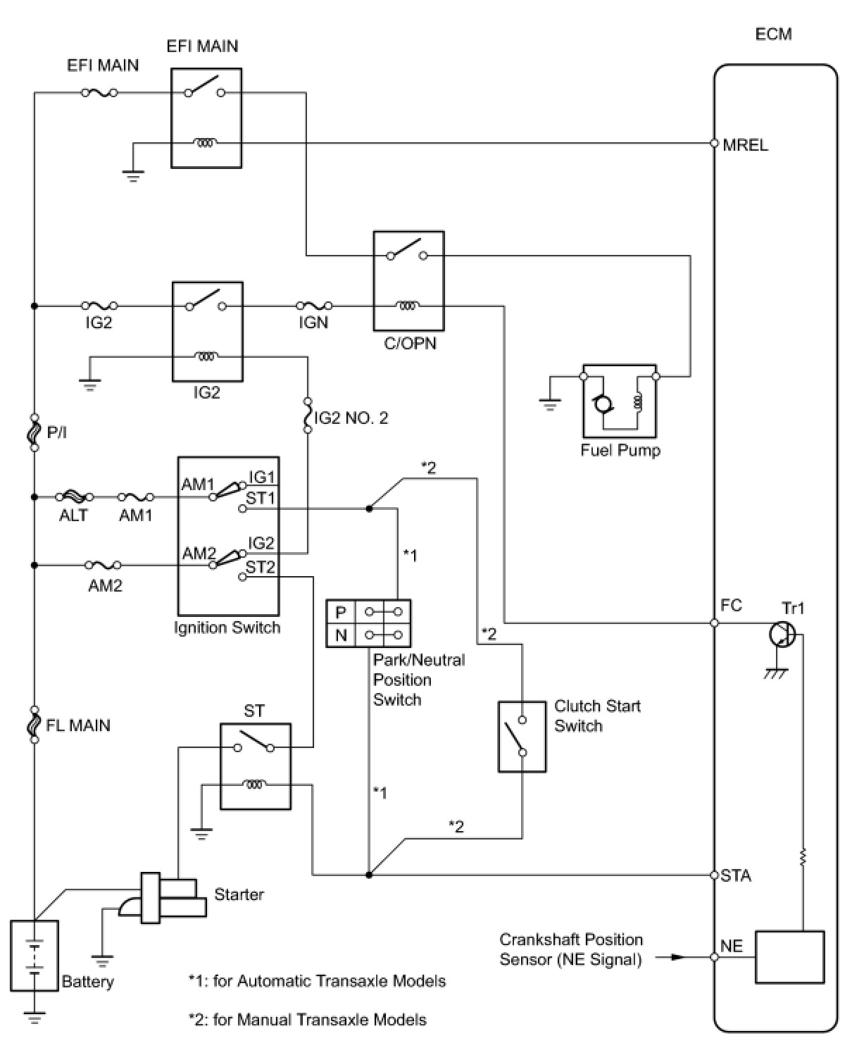When the engine is cranked, the starter relay drive signal from the ignition switch is input into the STA terminal of the ECM, and the NE signal generated by the crankshaft position sensor is also input into the NE+ terminal. Thus, the ECM interprets that the engine is being cranked, and turns transistor Tr1 in the ECM internal circuit ON. The current flows to the C/OPN (Circuit Opening) relay by turning Tr1 ON. Then, the fuel pump operates.