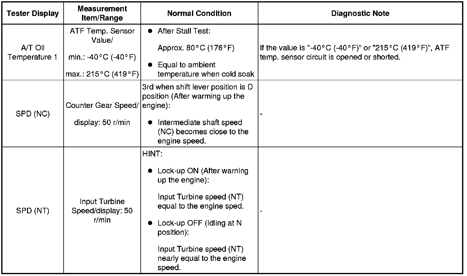 HINT: Using Techstream to read the Data List allows the values or states of switches, sensors, actuators and other items to be read without removing any parts. This non-intrusive inspection can be very useful because intermittent conditions or signals may be discovered before parts or wiring is disturbed. Reading the Data List information early in troubleshooting is one way to save diagnostic time.