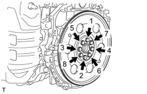 FLYWHEEL SUB-ASSEMBLY (for Manual Transaxle)In several steps, uniformly install and tighten the 8 bolts in the sequence shown in the illustration.
