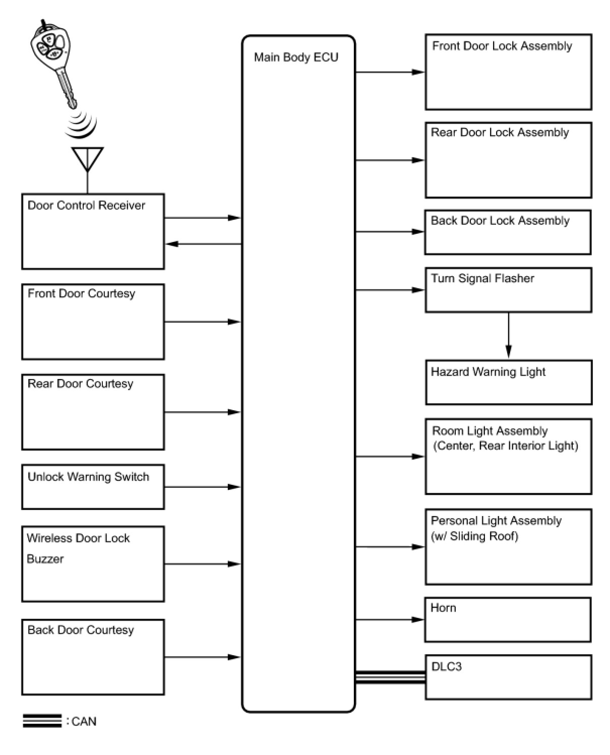 The wireless door lock control system functions to lock and unlock all the doors from a distance. The system is controlled by a hand-held transmitter which sends radio waves to the door control receiver. The main body ECU performs an ID code identification process and engages the door lock control.