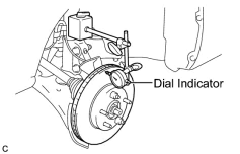 (c) Using a dial indicator, measure the disc runout 10 mm (0.394 in.) away from the outer edge of the front disc.