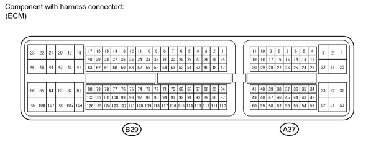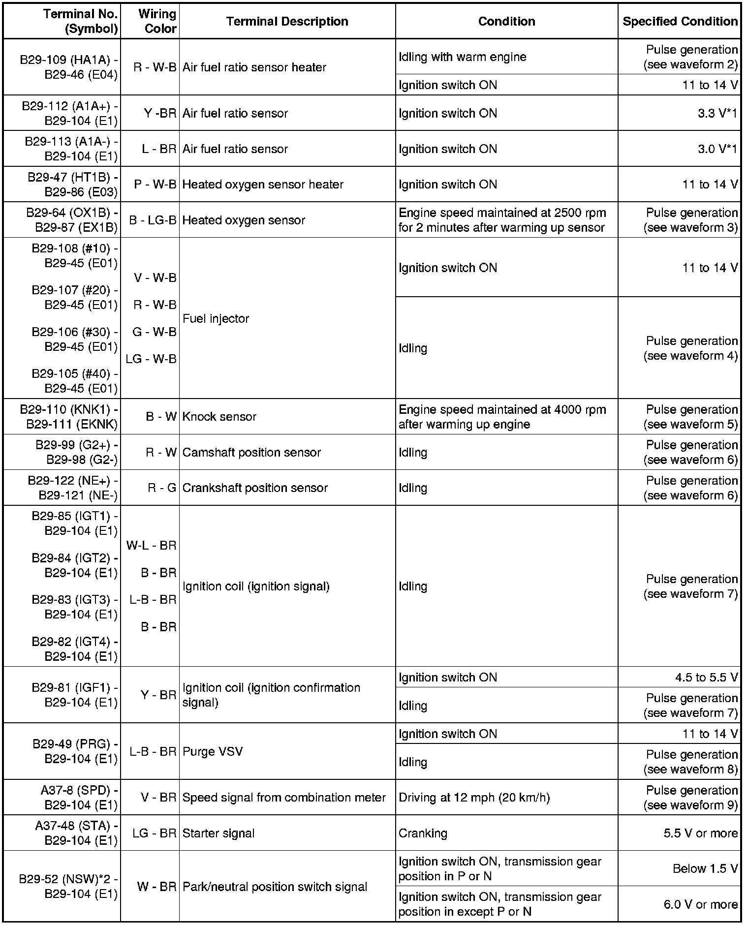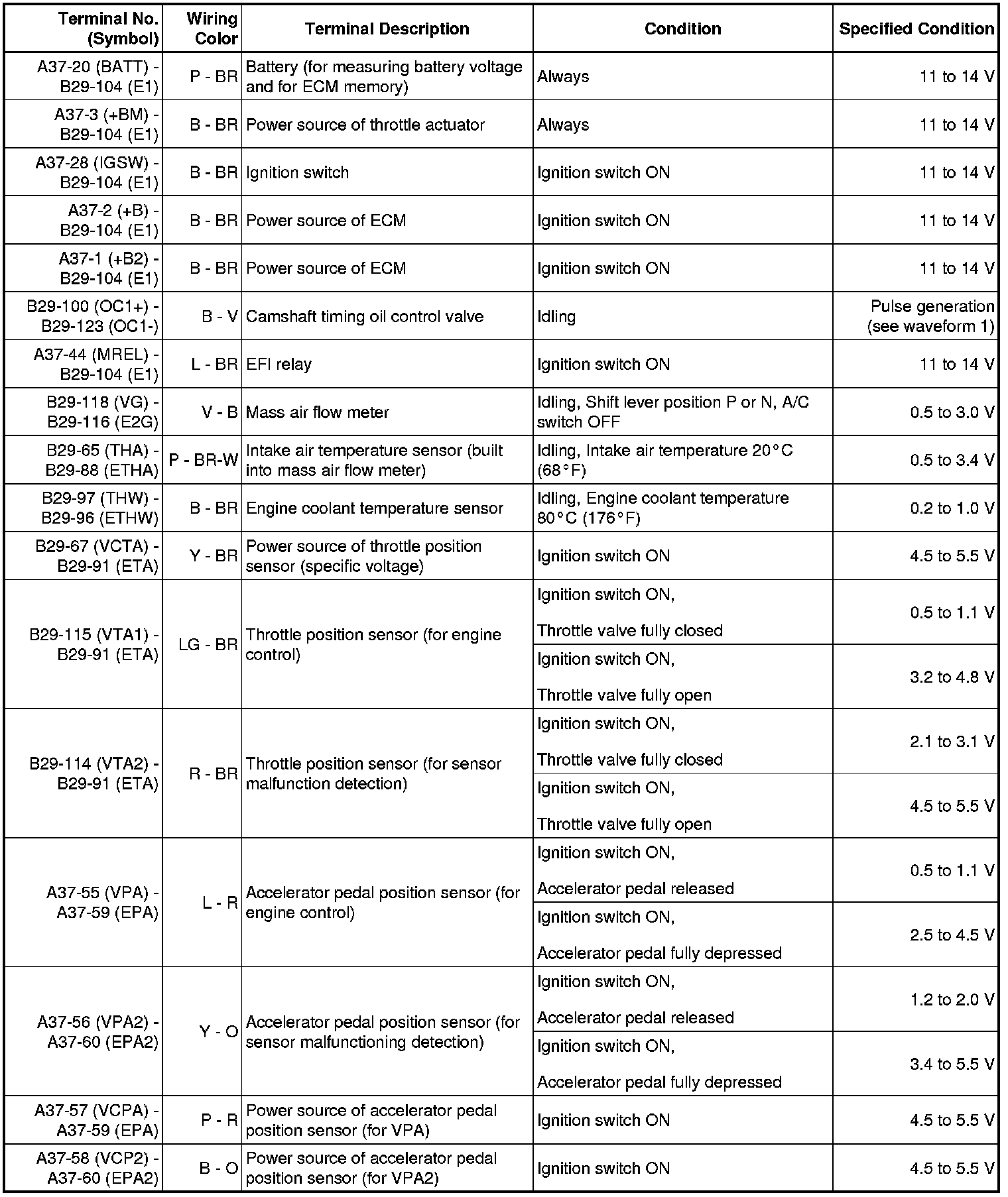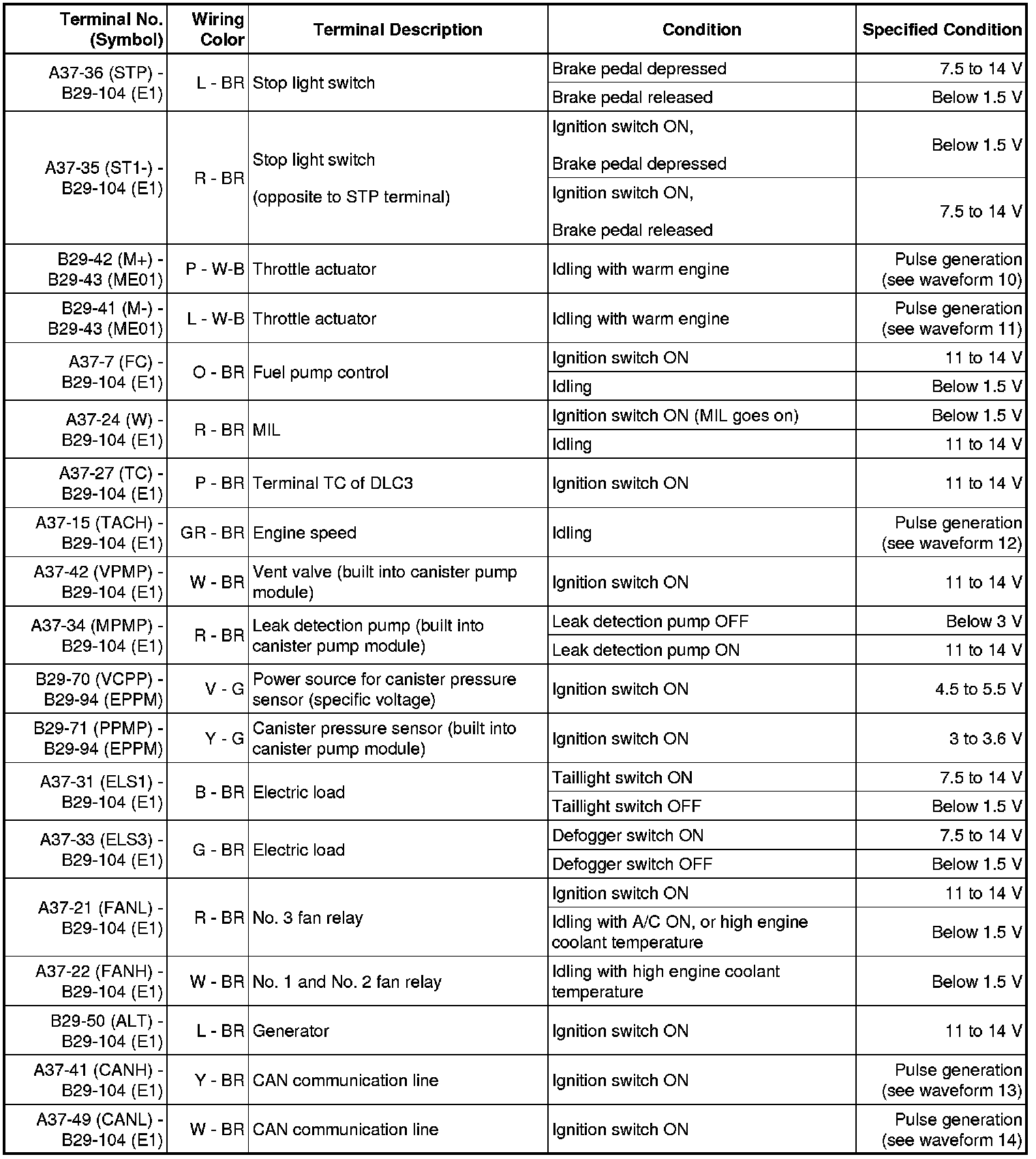 HINT: The standard normal voltage between each pair of ECM terminals is shown in the table below. The appropriate conditions for checking each pair of terminals are also indicated. The result of checks should be compared with the standard normal voltage for that pair of terminals, displayed in the Specified Condition column. The illustration above can be used as a reference to identify the ECM terminal locations.