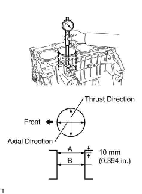 (a) Using a cylinder gauge, measure the cylinder bore diameter at positions A and B in the thrust and axial directions.