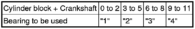 - If replacing a bearing, select a new one with the same number. If the number of the bearing cannot be determined, calculate the correct bearing number by adding together the numbers imprinted on the cylinder block and crankshaft. Then select a new bearing with the calculated number. There are 4 sizes of standard bearings, marked "1", "2", "3" and "4" accordingly.