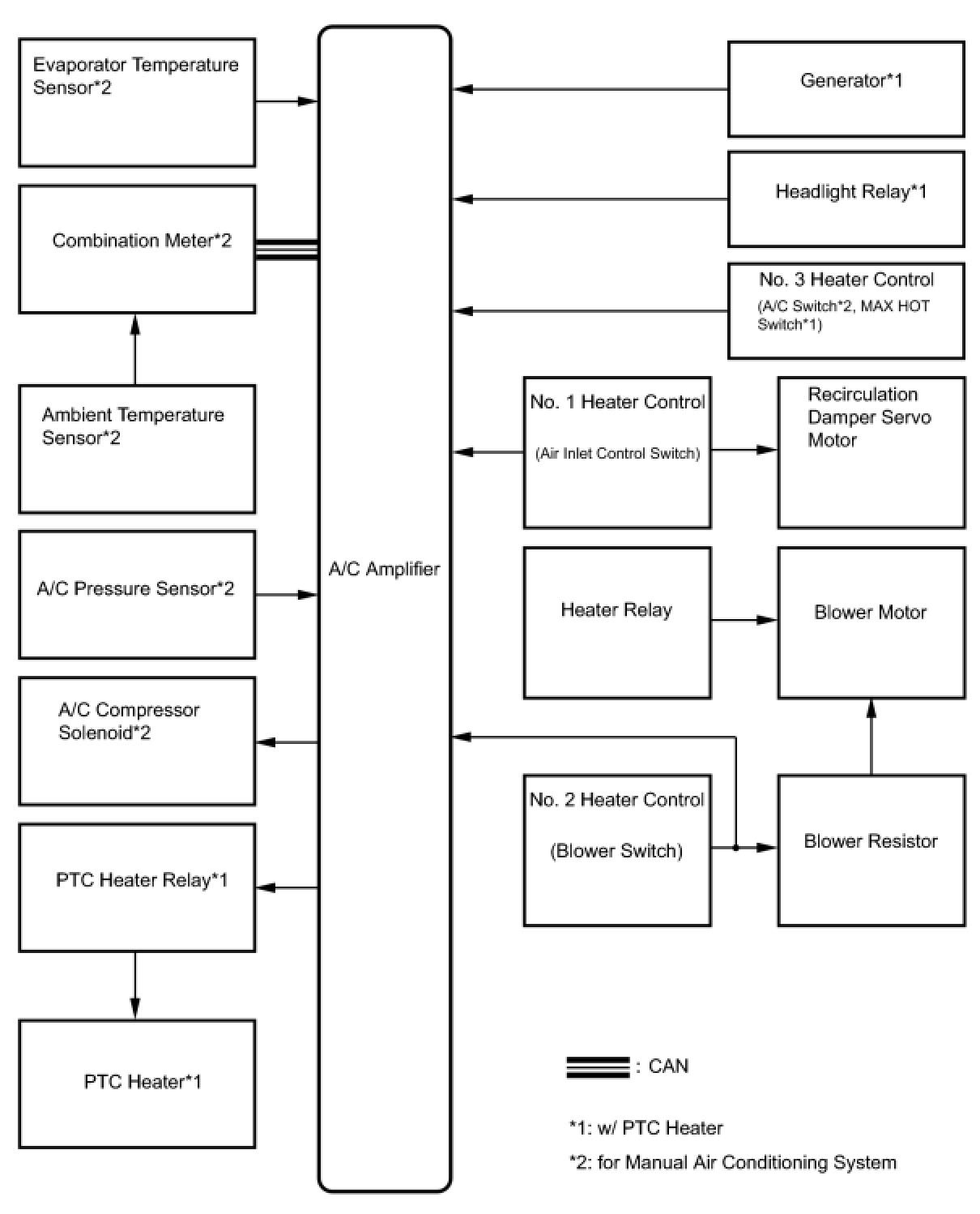 (1) The PTC heater is turned on and off by the air conditioning amplifier in accordance with the water temperature, ambient temperature, engine speed, air mix setting, and electrical load (generator power ratio).