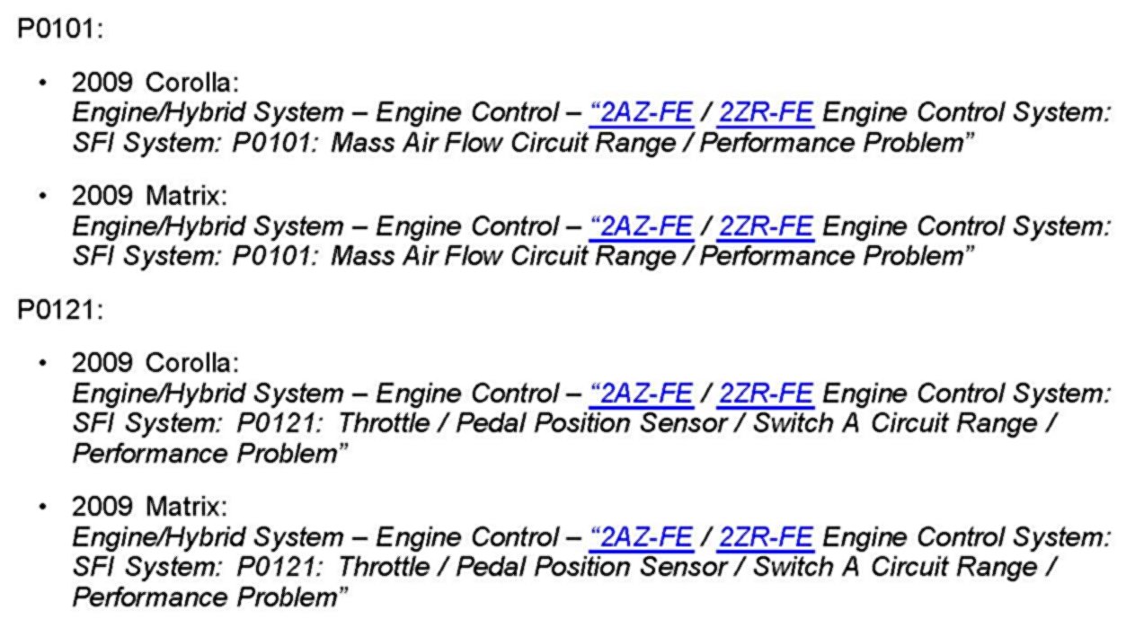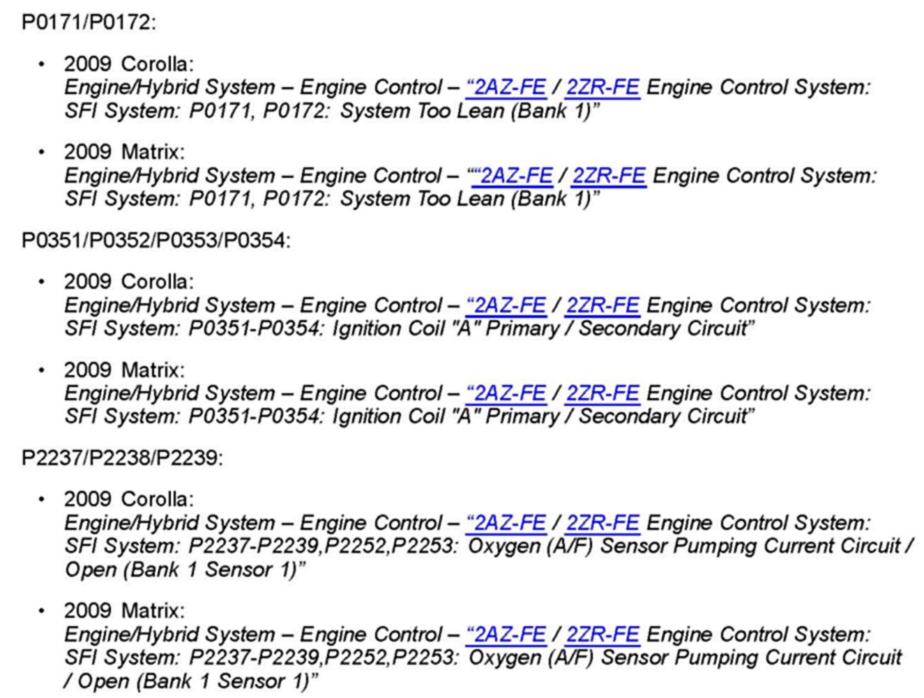 Some 2009 model year Corolla and Matrix vehicles may exhibit a M.I.L. "ON" DTC condition with one or more of the following Diagnostic Trouble Codes (DTCs):