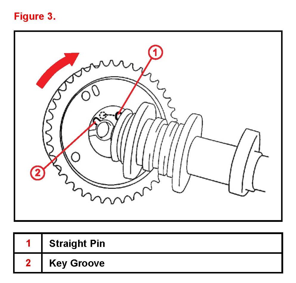 C. Install the timing gear assembly onto the camshaft with the straight pin slightly to the right of the key groove as shown in Figure 3.