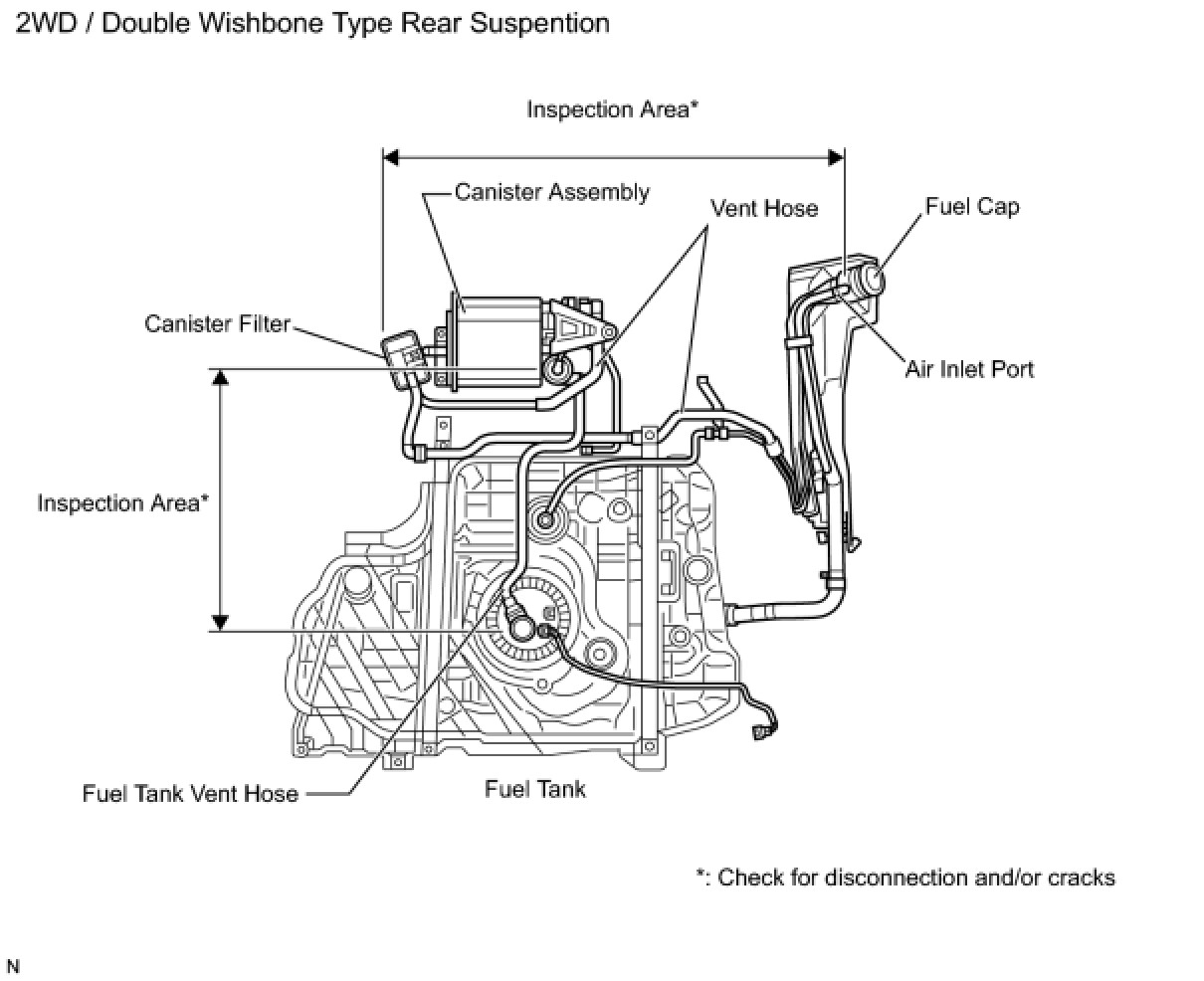 HINT: Disconnect the hose between the canister and the fuel tank from the canister. Block the canister side and conduct an inspection. In this way, the fuel tank can be excluded as an area suspected of causing fuel leaks.