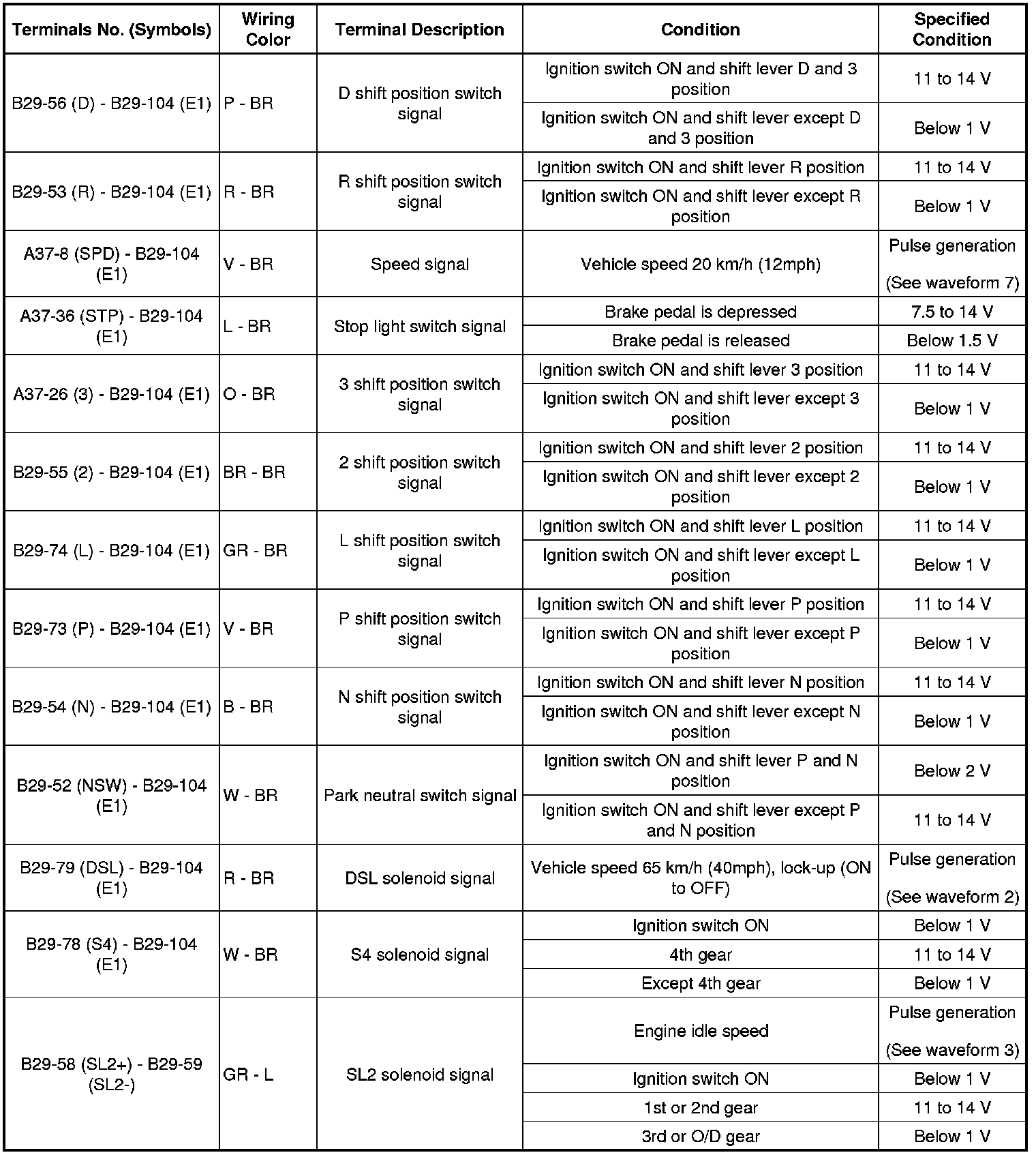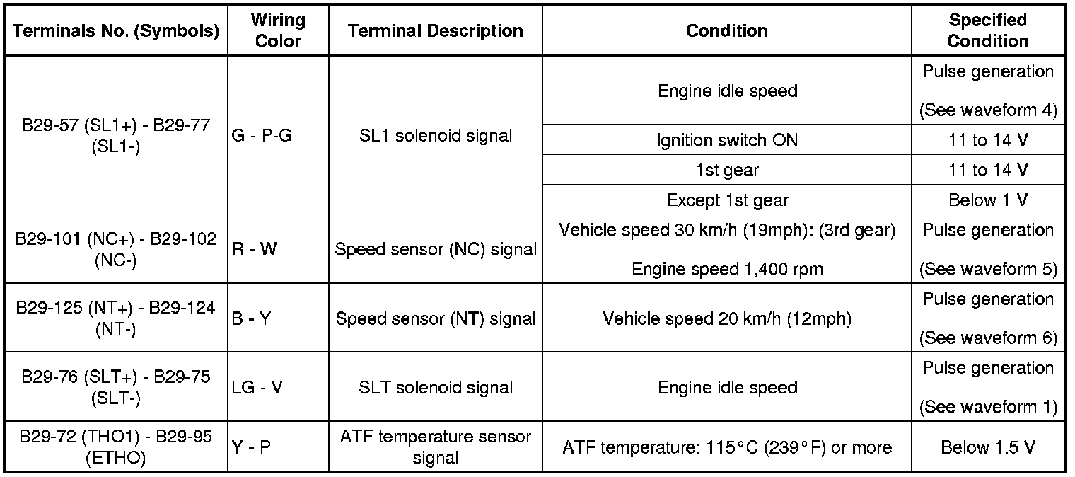In the table, first follow the information under "Condition". Look under "Terminal No. (Symbols)" for the terminals to inspected. The standard voltage between the terminals is shown under "Specified Condition".