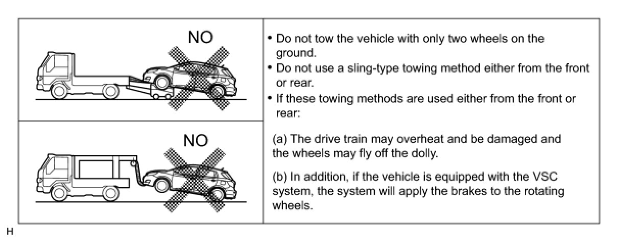(c) The following towing methods shown below are dangerous and can damage the vehicle, so do not use them.