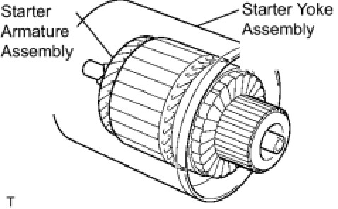 NOTE: The magnet of the starter yoke assembly may attract the starter armature assembly when the starter commutator end frame assembly is installed, causing the magnet to break.
