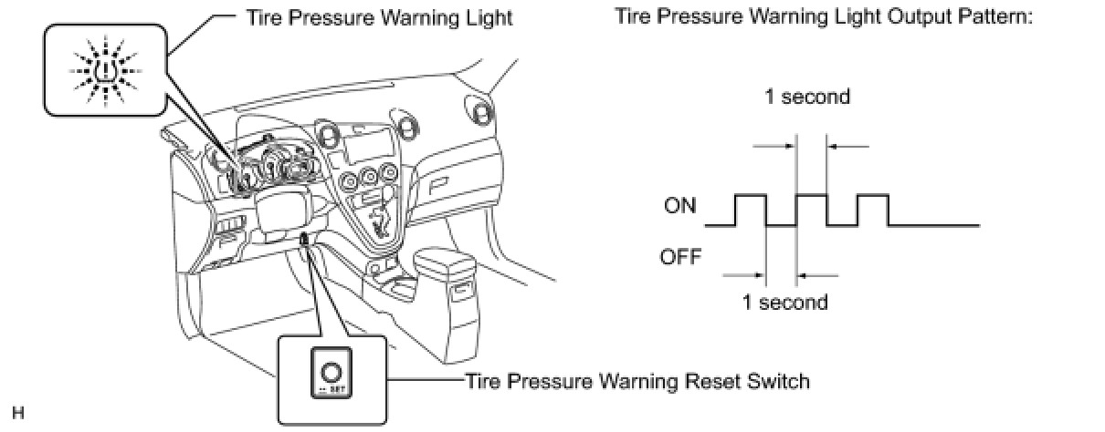 - After all IDs are registered, DTC C2126/26 (Transmitter ID not Received) is set in the tire pressure warning ECU and the tire pressure warning light blinks for 1 minute and then comes on. When the tire pressure warning ECU successfully receives signals from all the transmitters whose IDs are stored in the ECU, DTC C2126/26 is cleared and the tire pressure warning light goes off.