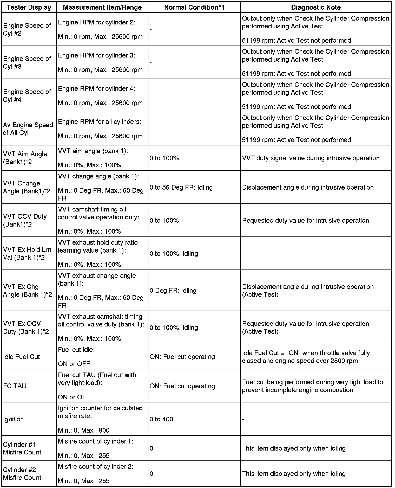 HINT: *2: While the Active Test item Check the Cylinder Compression is being performed, the fuel and ignition of all cylinders is cut. At this time, the ECM measures the speed of each cylinder while the engine is being cranked.