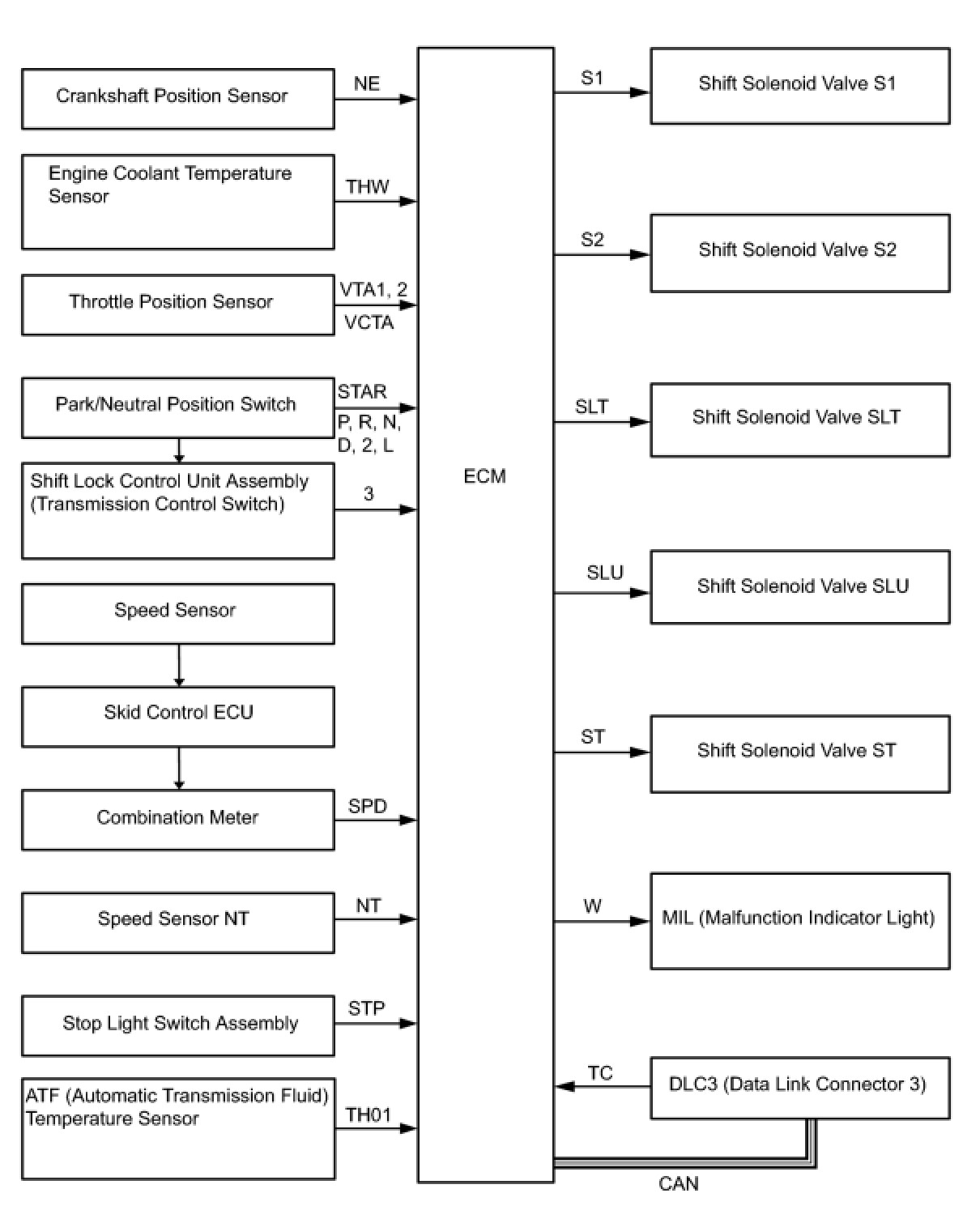 The configuration of the electronic control system in the U341E automatic transaxle is as shown in the following chart.