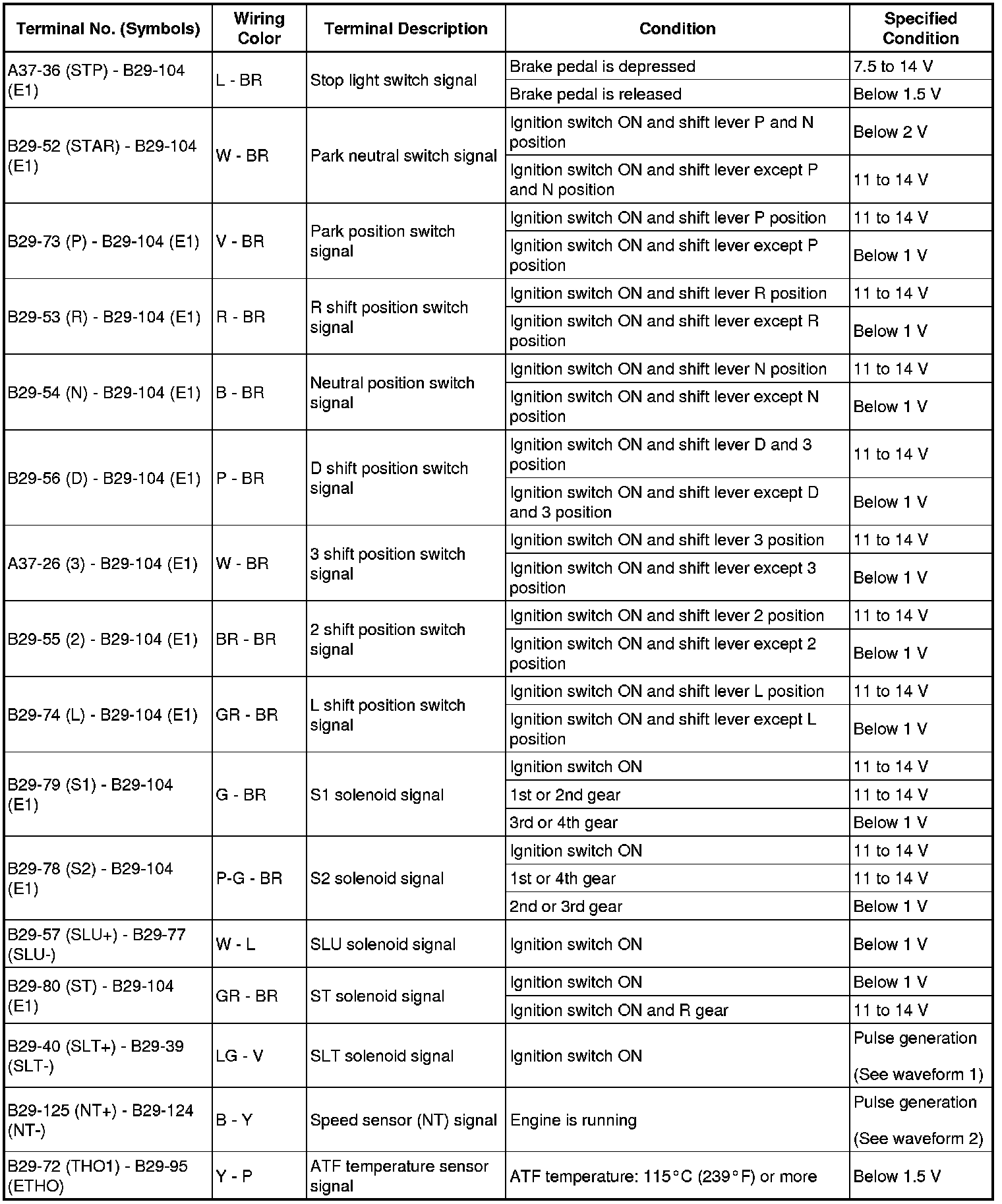 In the table, first follow the information under "Condition". Look under "Terminal No. (Symbols)" for the terminals to inspected. The standard voltage between the terminals is shown under "Specified Condition".