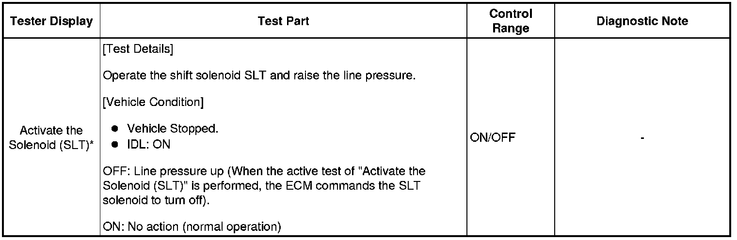 *: "Activate the Solenoid (SLT)" in the Active Test is performed to check the line pressure changes by connecting the SST to the automatic transaxle, which is used in the HYDRAULIC TEST Hydraulic Test as well.
