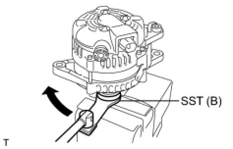 (f) Loosen the pulley by turning SST (B) in the direction shown in the illustration.