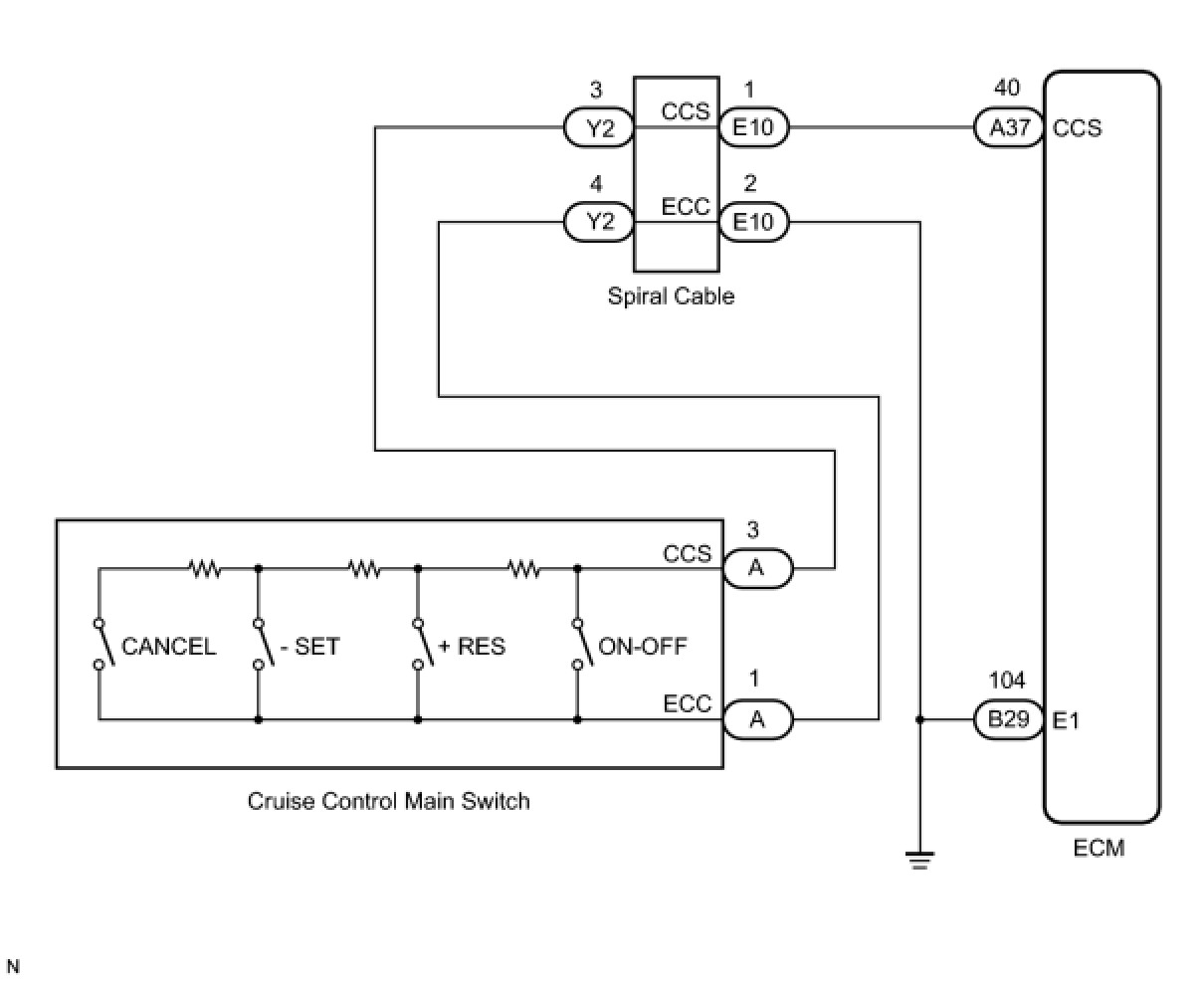 The cruise control main switch operates 7 functions: SET, - (COAST), TAP-DOWN, RES (RESUME), + (ACCEL), TAP-UP, and CANCEL. The SET, TAP-DOWN, and - (COAST) functions, and the RES (RESUME), TAP-UP, and + (ACCEL) functions are operated with the same switch. The cruise control main switch is an automatic return type switch which turns on only while operating it in each direction and turns off after releasing it. The internal contact point of the cruise control main switch is turned on with the switch operation. Then the ECM reads the voltage value that has been changed by the switch operation to control SET, - (COAST), RES (RESUME), + (ACCEL), and CANCEL.
