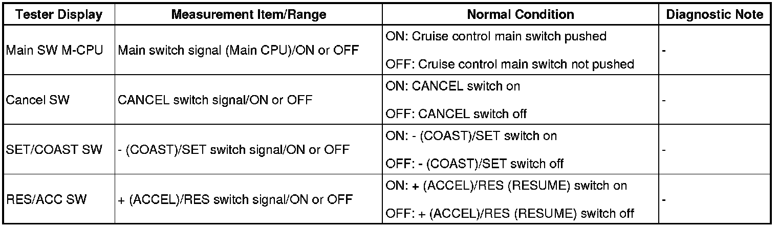 (e) Check the Data List for proper functioning of the cruise control main switch.