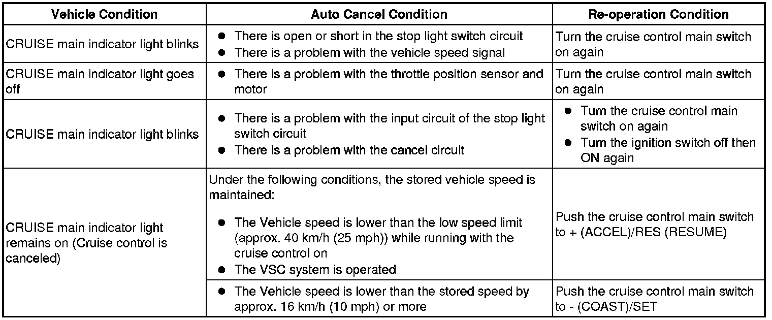 HINT: If the following conditions are detected while the cruise control is in operation, the system clears the stored vehicle speed in the ECM and cancels the cruise control operation.