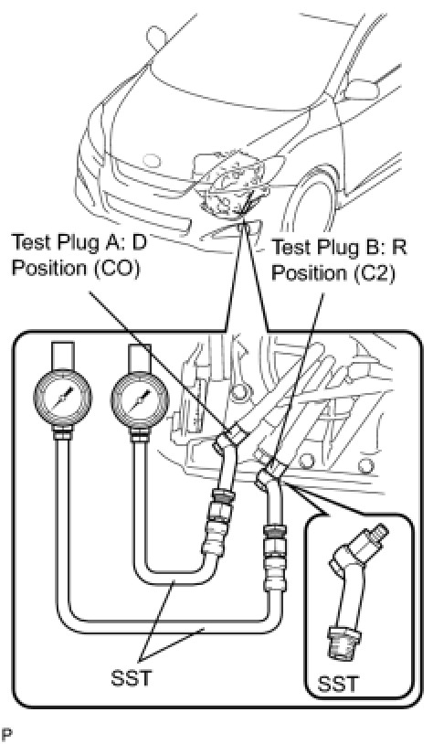 (5) Remove the test plug A on the transaxle case front left side and install the SST.