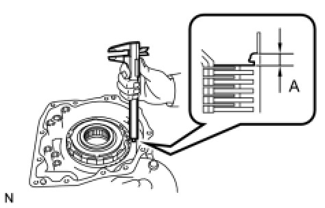 (a) Using a vernier caliper, measure the distance between the disc surface and the contact surface of the 2nd brake cylinder and transaxle case (Dimension A).