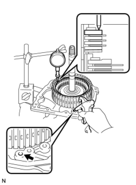 (a) Using a dial indicator, measure the overdrive clutch pack clearance while applying and releasing compressed air (392 kPa, 4.0 kgf/cm2, 57 psi).