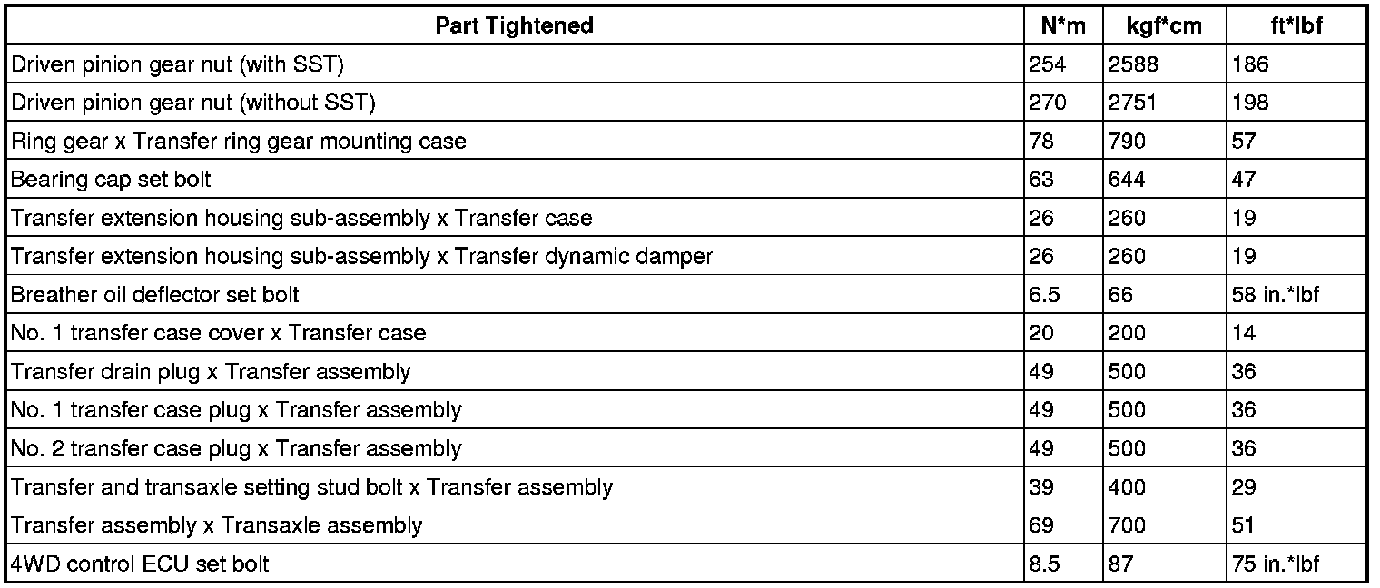 SPECIFICATIONS: MF1A TRANSFER / 4WD / AWD: TORQUE SPECIFICATIONS
