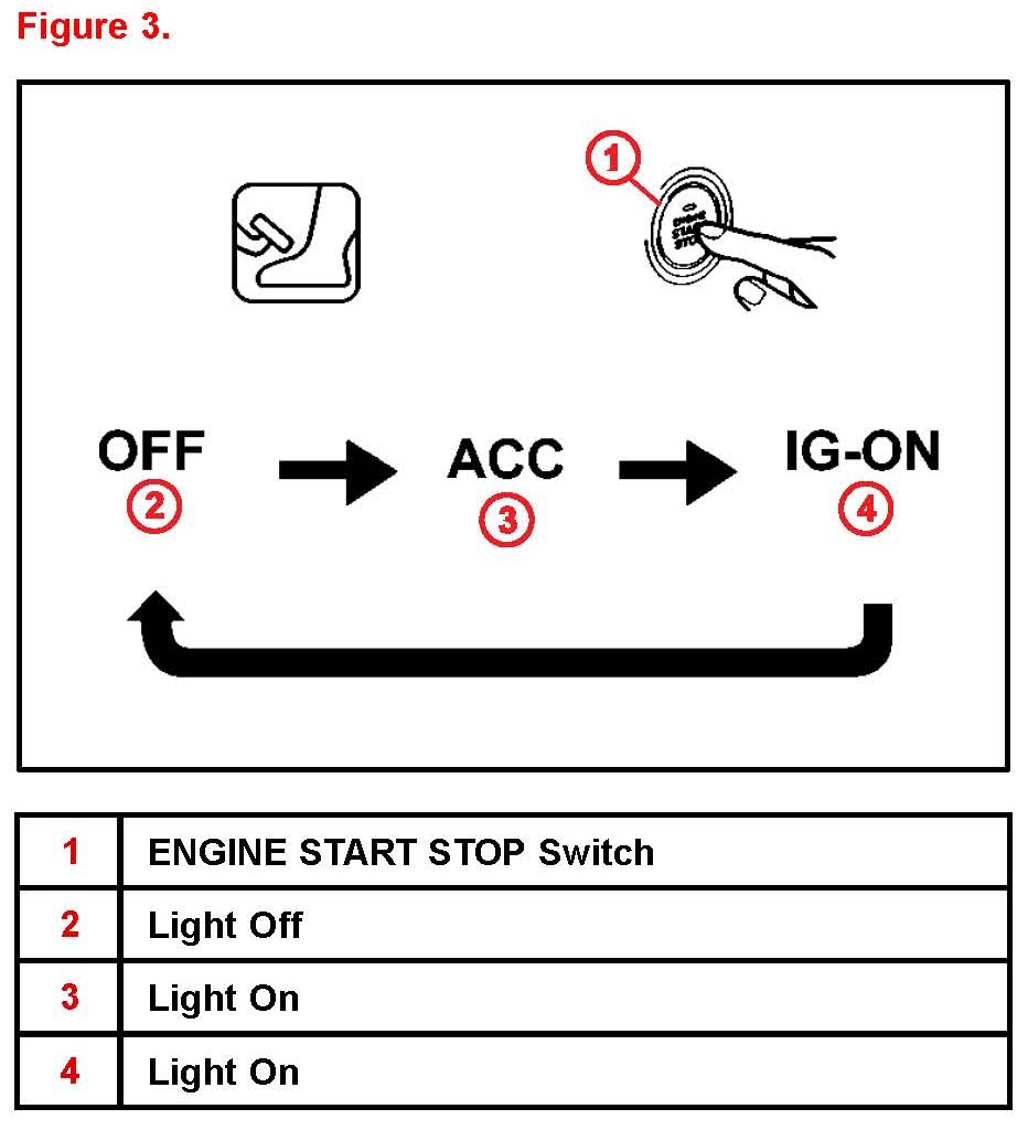 2. Without depressing the brake pedal, press the "ENGINE START STOP" switch and confirm the mode changes properly.