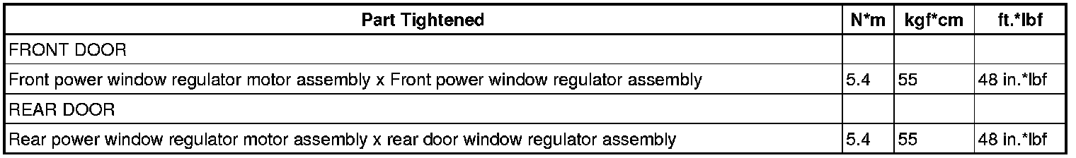 SPECIFICATIONS: WINDOW / GLASS: TORQUE SPECIFICATIONS