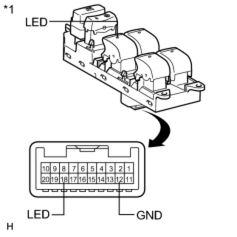 (1) Apply battery voltage to the power window regulator master switch assembly and check that the LED illuminates.