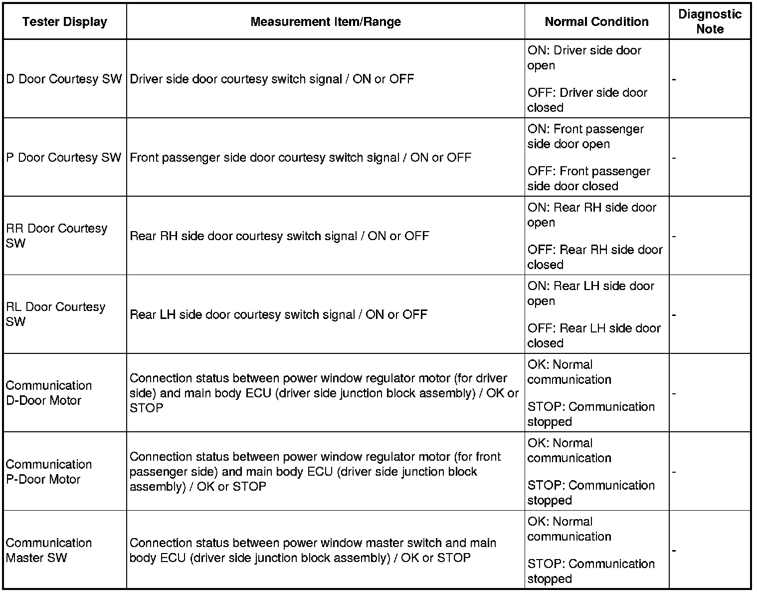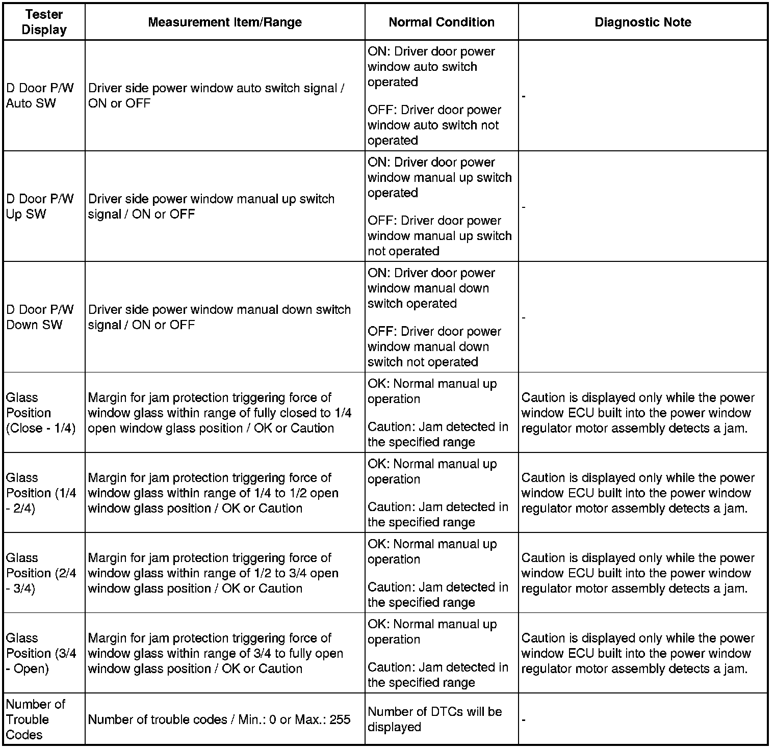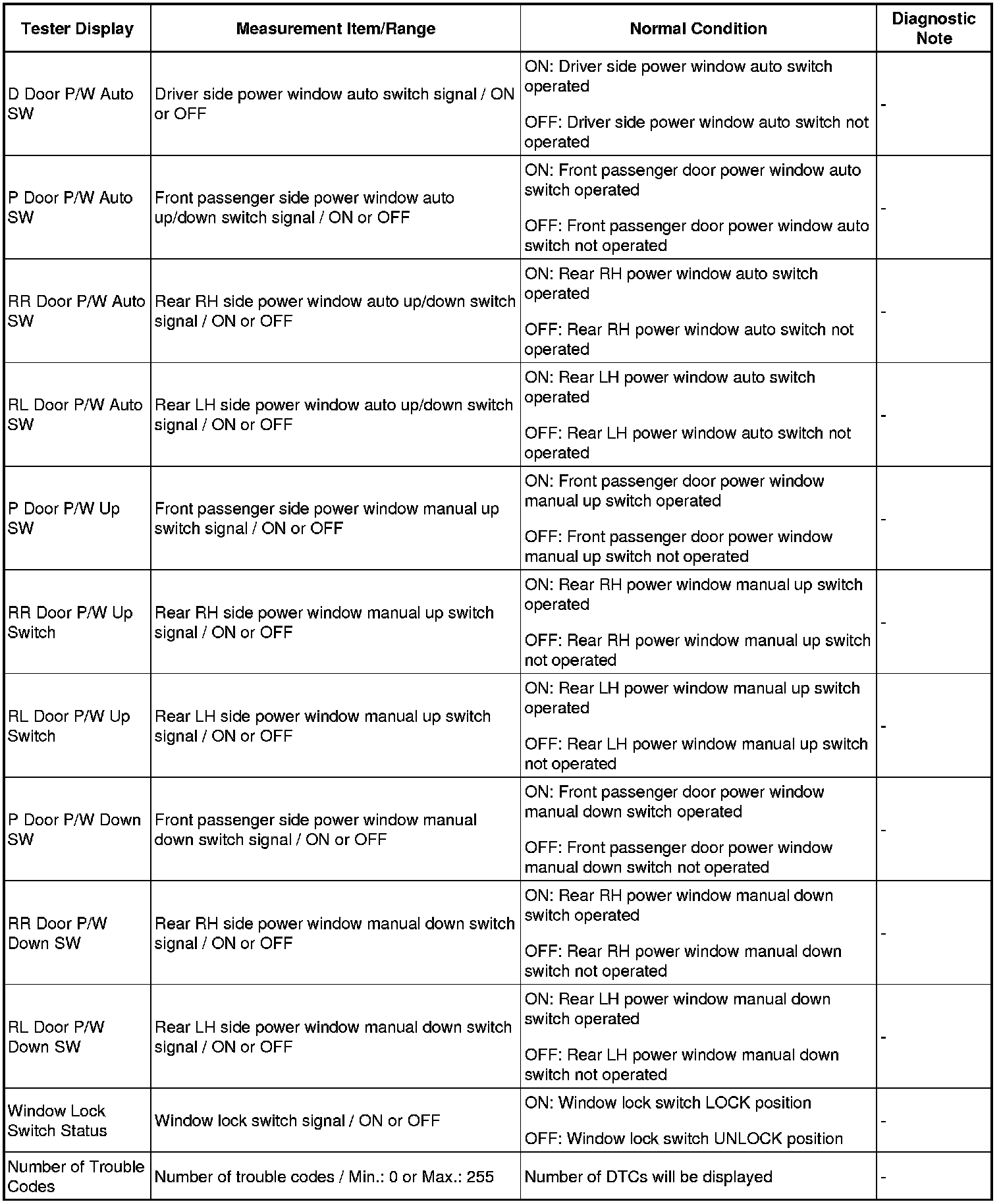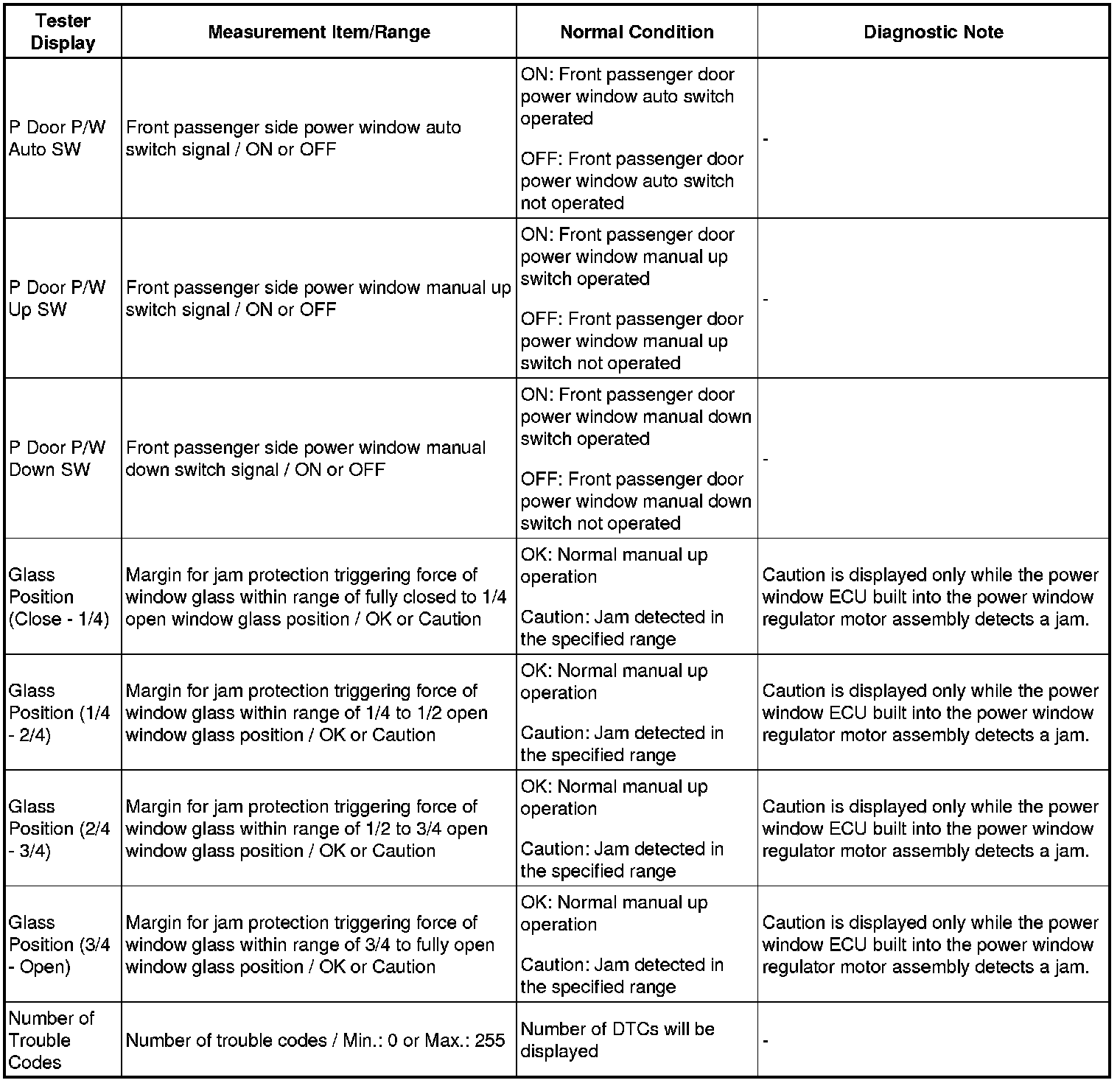 WINDOW / GLASS: POWER WINDOW CONTROL SYSTEM: DATA LIST / ACTIVE TEST