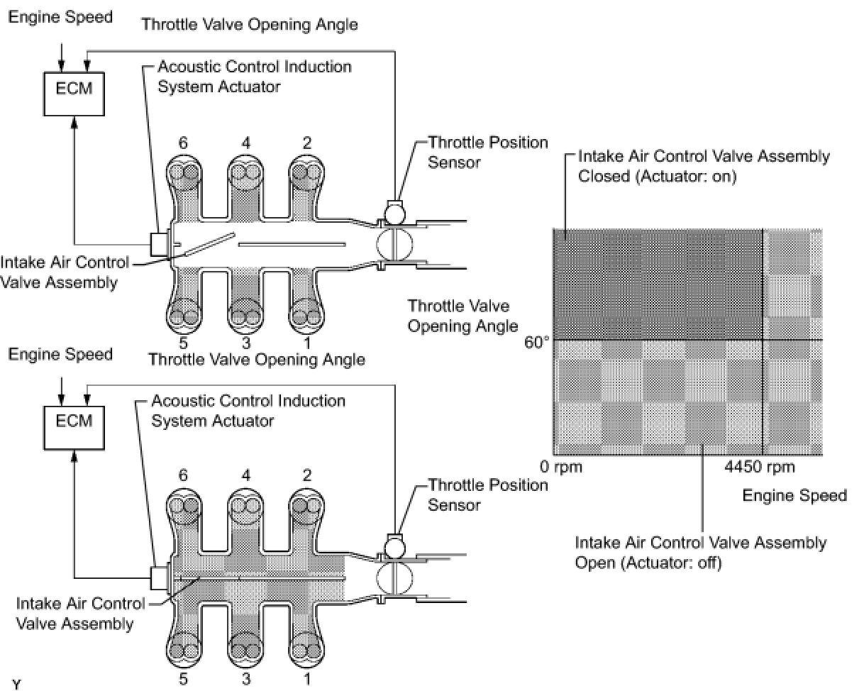 When the engine speed is between 0 and 4450 rpm and the throttle valve opening angle is 60° or more, the ECM supplies current to the actuator (on status), to close the intake air control valve assembly. Under other conditions, the actuator is usually off and the intake air control valve assembly is open.