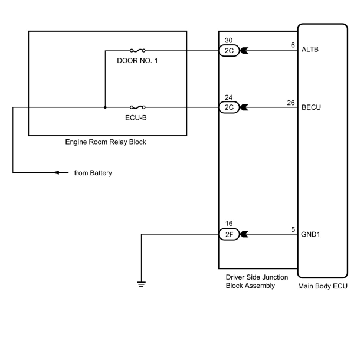 This circuit provides power for main body ECU (driver side junction block assembly) operation.