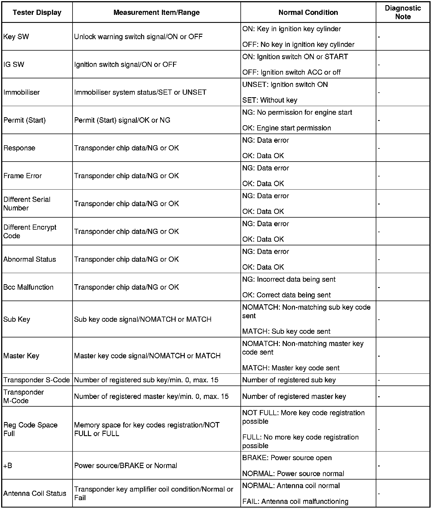 NOTICE: In the table below, the values listed under "Normal Condition" are reference values. Do not depend solely on these reference values when deciding whether a part is faulty or not.