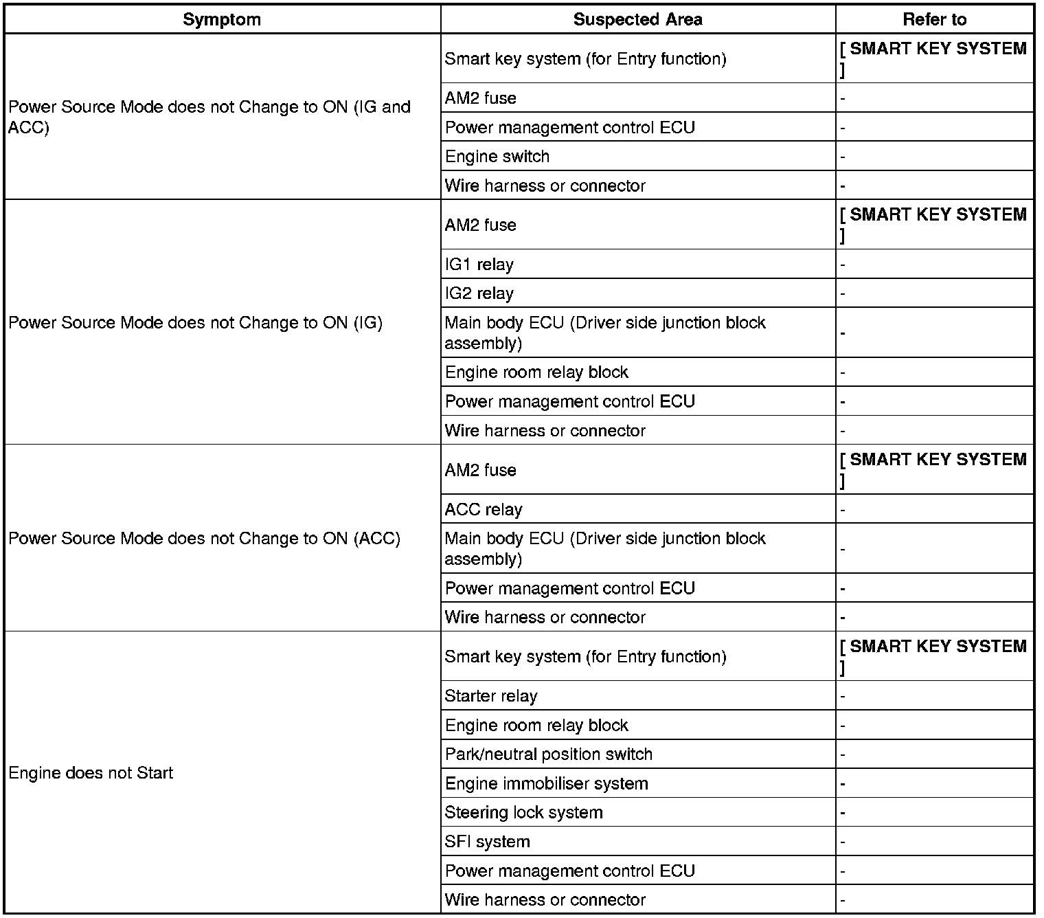 THEFT DETERRENT / KEYLESS ENTRY: SMART KEY SYSTEM (for Start Function): PROBLEM SYMPTOMS TABLE
