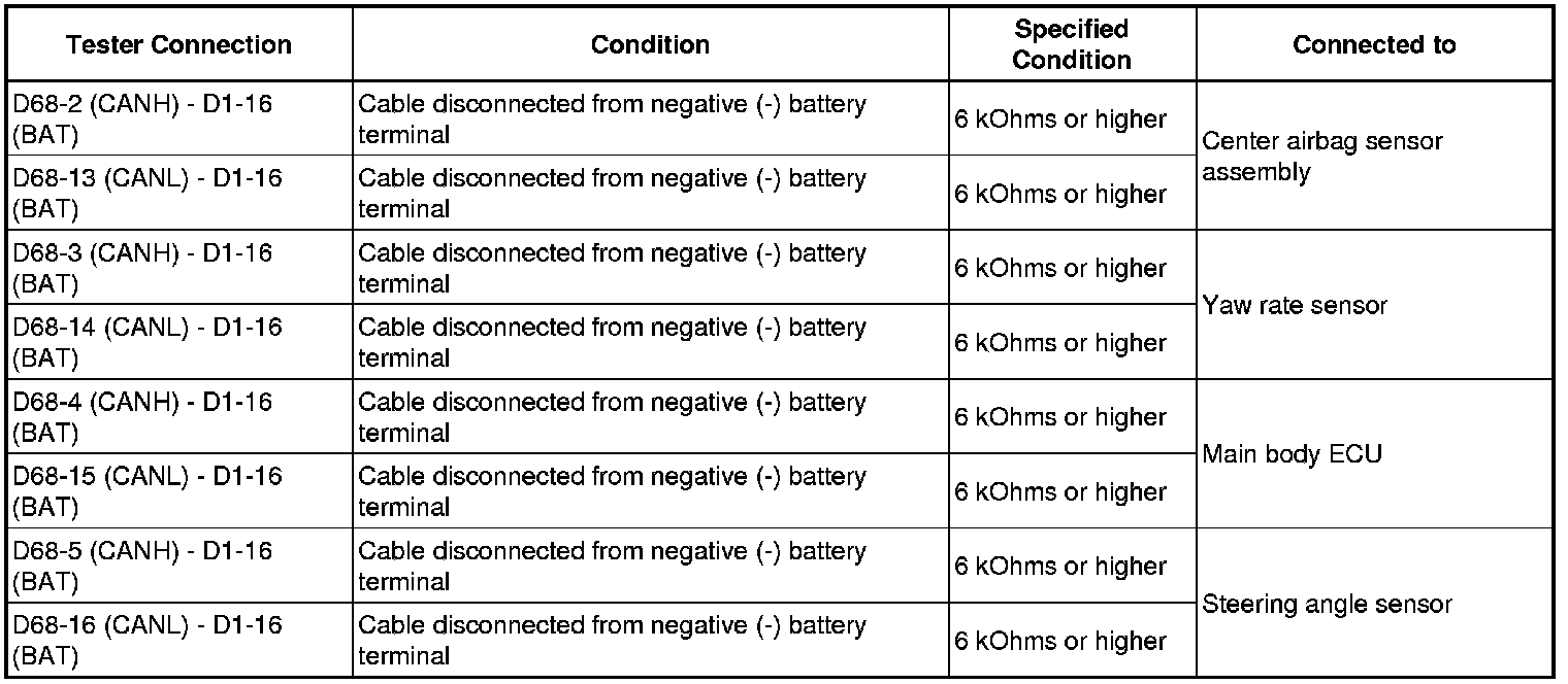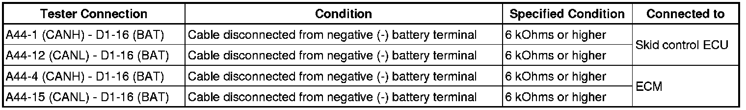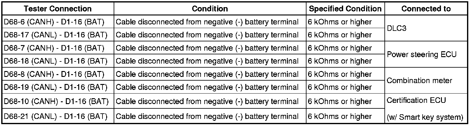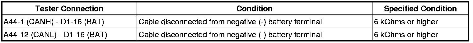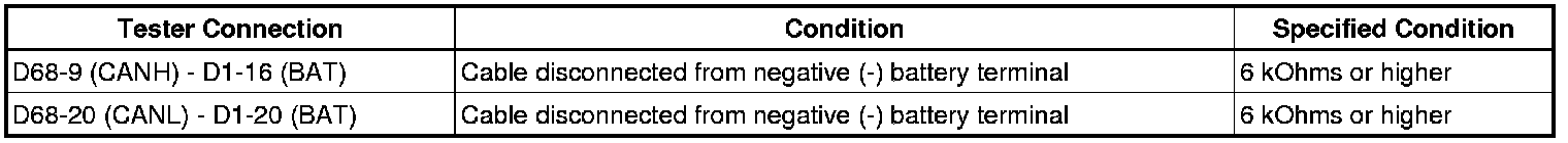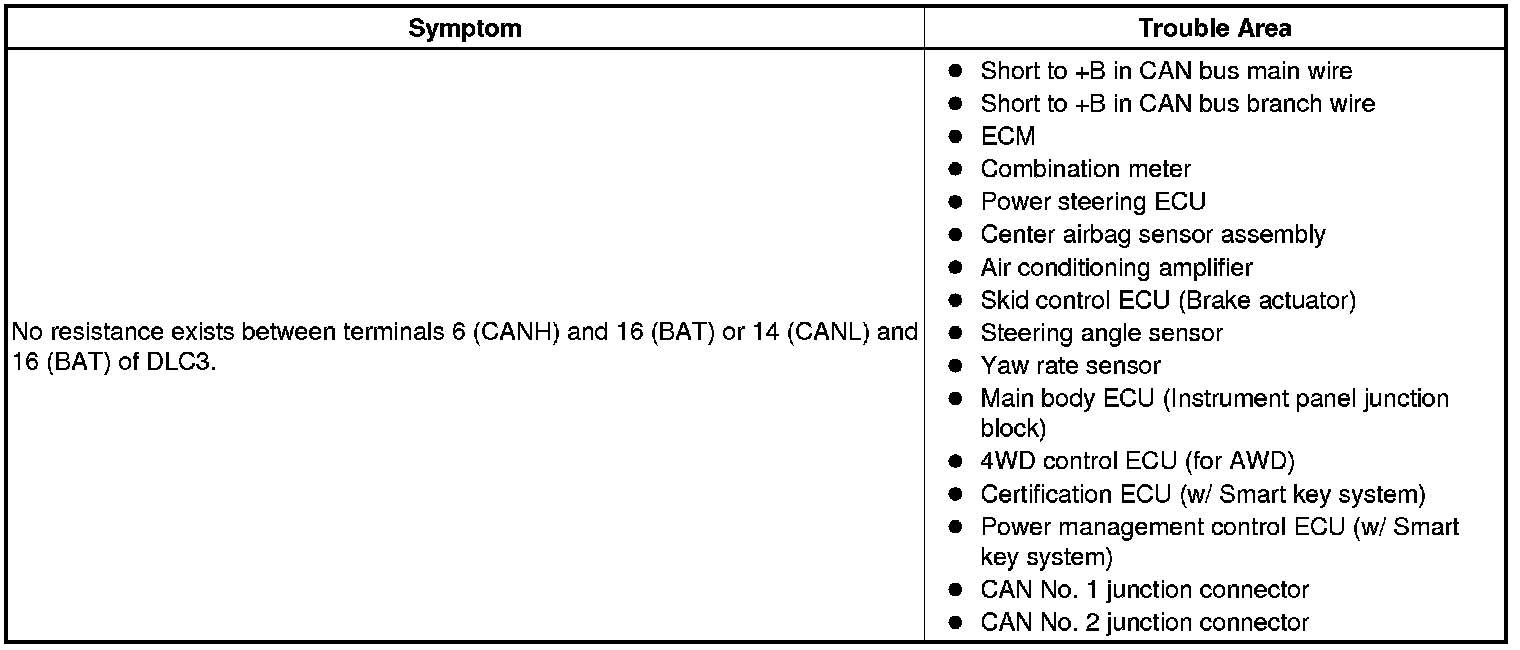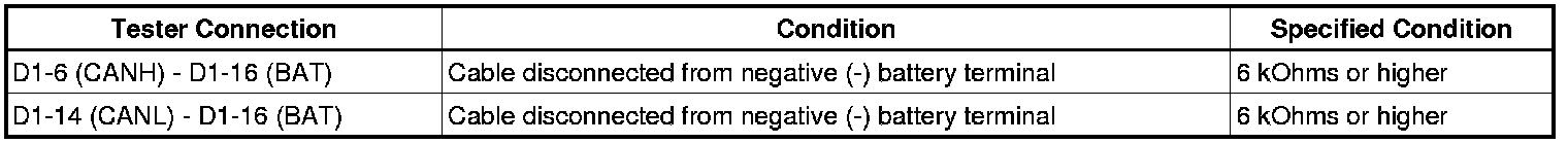 There may be a short circuit between the CAN bus main wire and +B when no resistance exists between terminals 6 (CANH) and 16 (BAT) or 14 (CANL) and 16 (BAT) of the DLC3.