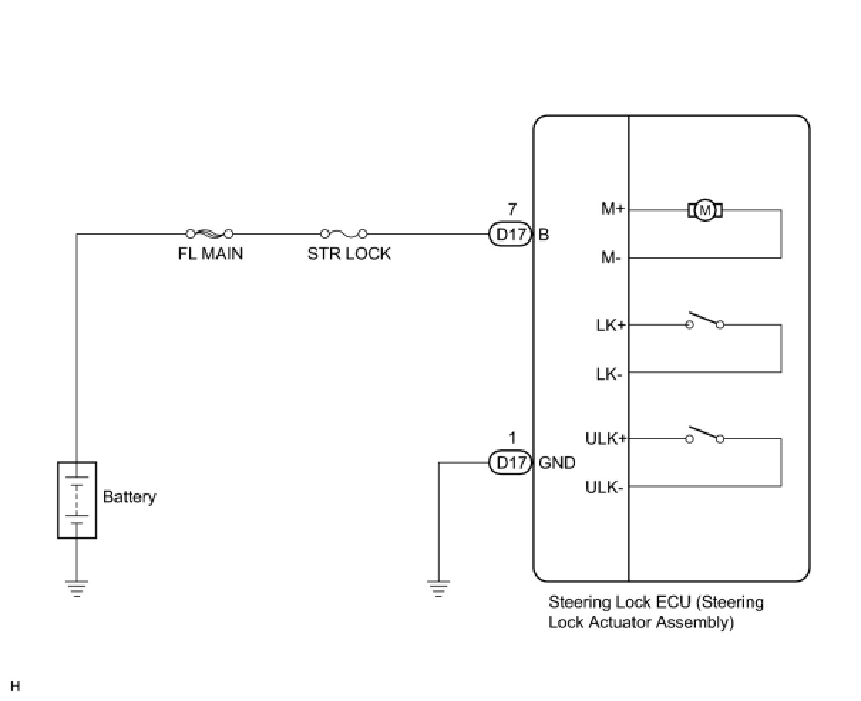 This circuit supplies power source voltage from the battery to terminal B of the steering lock ECU (steering lock actuator assembly). This is used as power source for the CPU, motor, communication, and peripheral circuits.