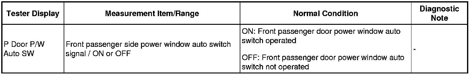 Front Passenger Side Power Window Auto Up / Down Function does not Operate with Front Passenger Side Power Window Switch