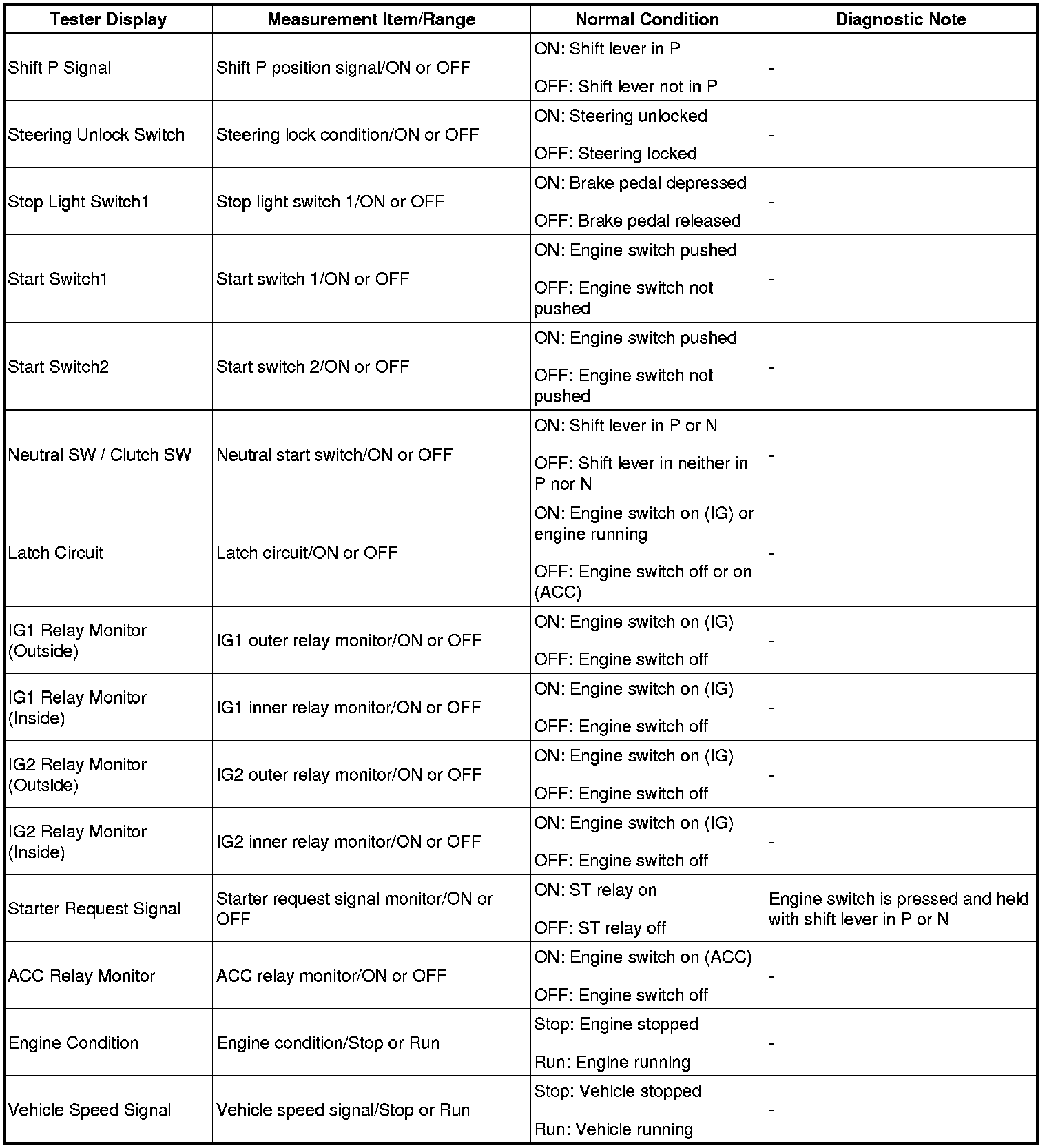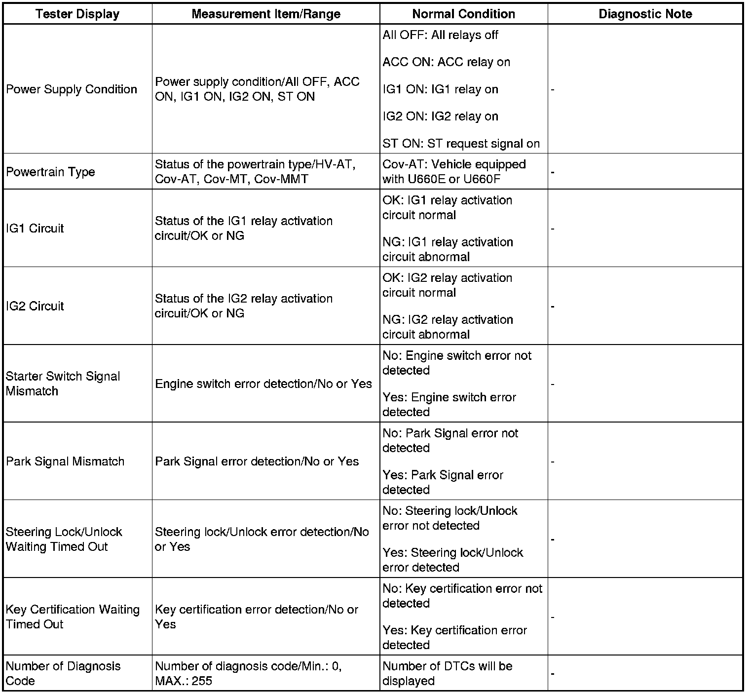 HINT: Using the Techstream to read the Data List allows the values or states of switches, sensors, actuators and other items to be read without removing any parts. This non-intrusive inspection can be very useful because intermittent conditions or signals may be discovered before parts or wiring is disturbed. Reading the Data List information early in troubleshooting is one way to save diagnostic time.