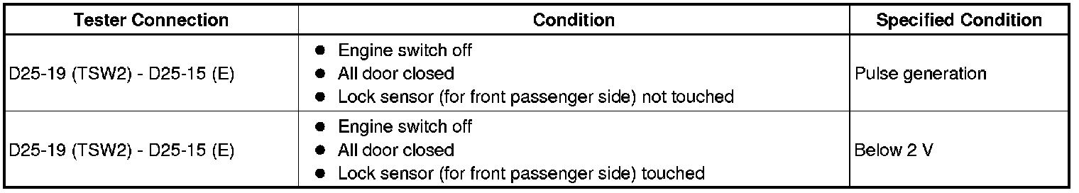 If the front passenger door entry unlock function operates normally, but its entry lock function does not, this means that the request code from the front passenger door is being output normally. In this case, a malfunction in the lock sensor circuit (from the certification ECU (smart key ECU assembly) to the front door outside handle assembly (lock sensor)) is suspected.