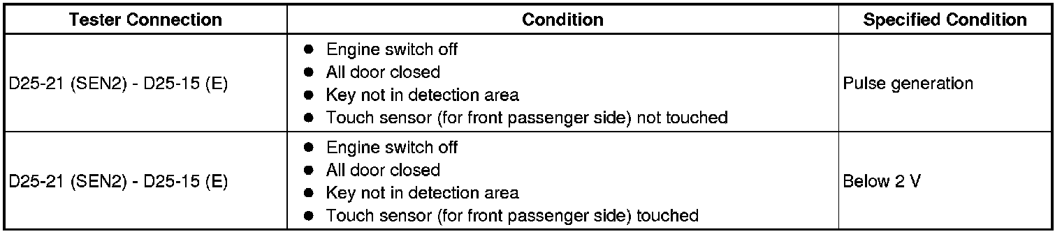 If the front passenger door entry lock function operates normally, but its entry unlock function does not, this means that the request code from the front passenger door is being output normally. In this case, a malfunction in the touch sensor circuit (from the certification ECU (smart key ECU assembly) to the front door outside handle assembly (touch sensor)) is suspected.
