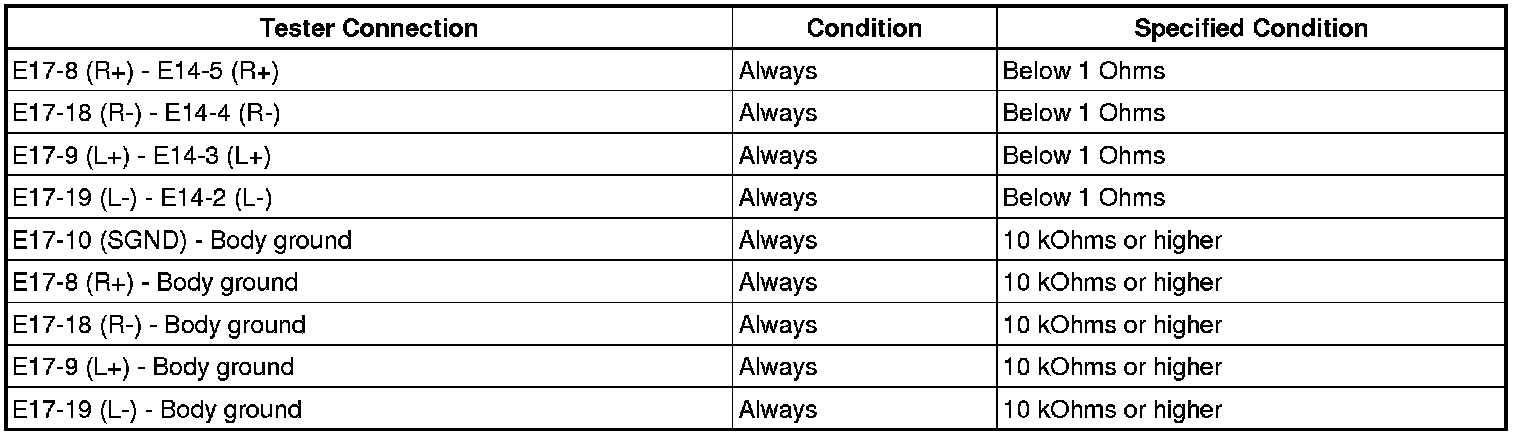 If there is an open or short in the circuit, sound cannot be heard from the speakers even if there is no malfunction in the stereo component amplifier or speakers.