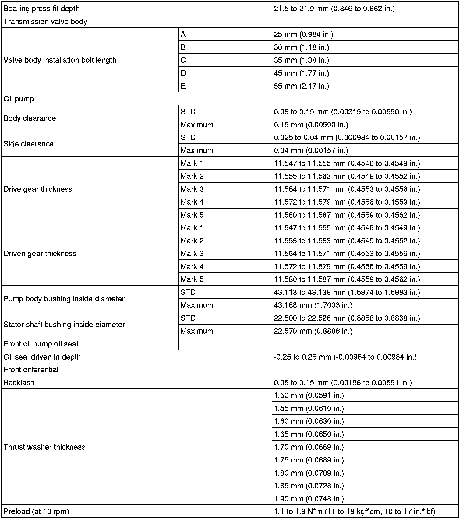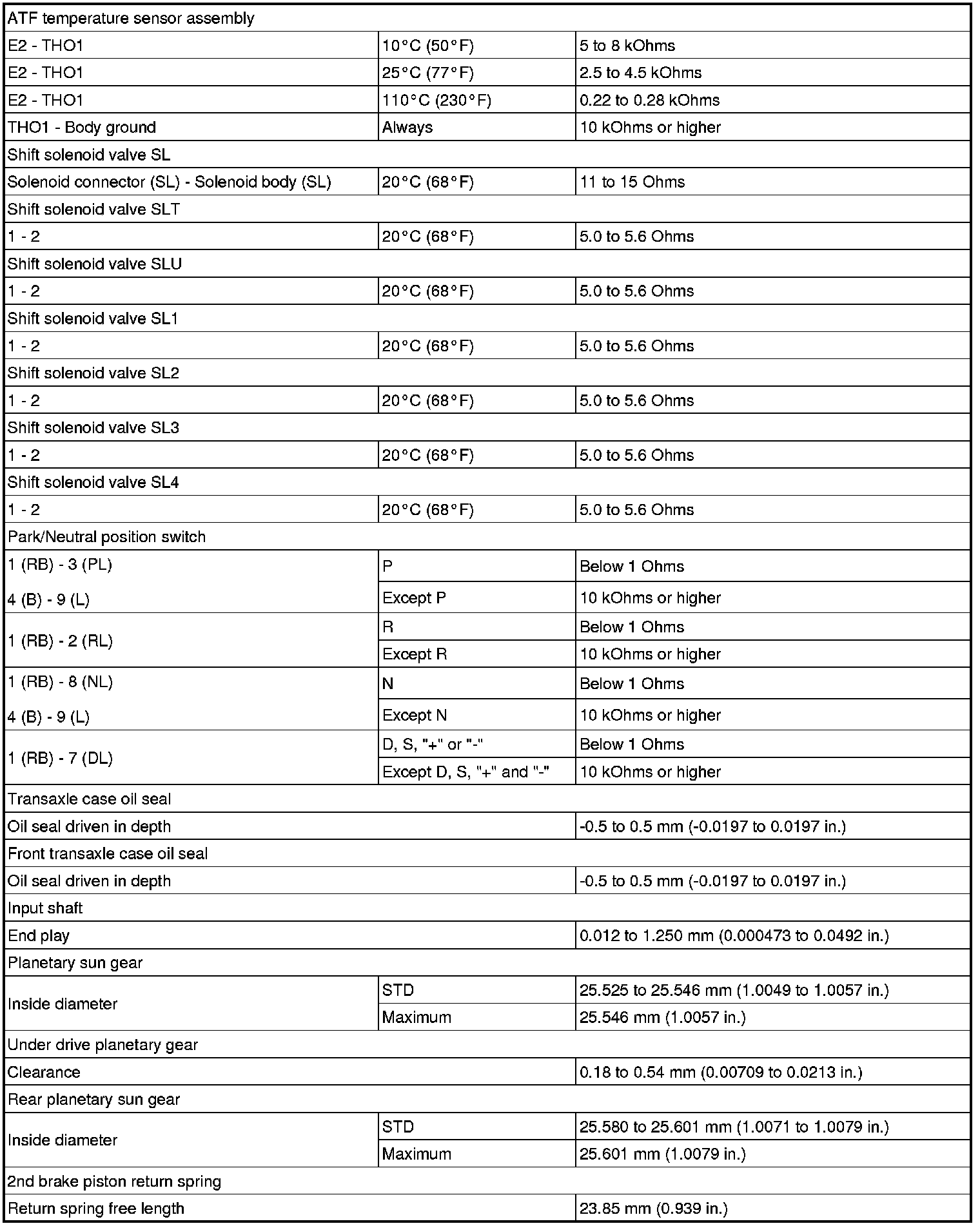 SPECIFICATIONS: U660E AUTOMATIC TRANSMISSION / TRANSAXLE: SERVICE DATA