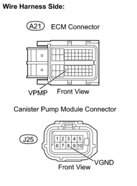 (c) Check the resistance between VPMP terminal of the ECM connector and VGND terminal of the canister pump module connector.