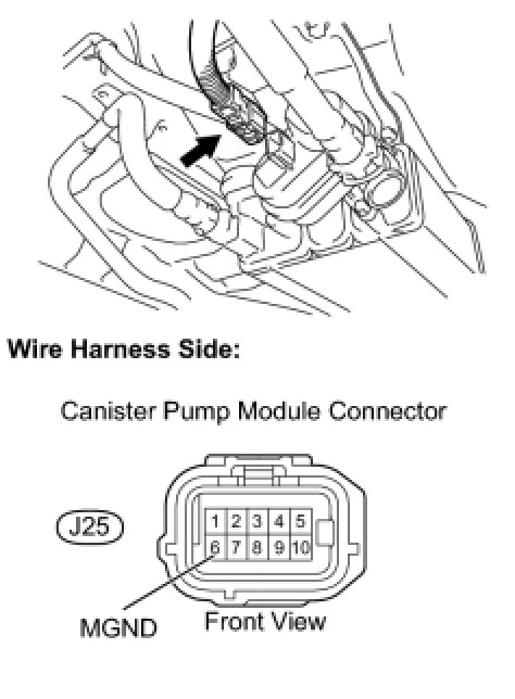 NOTE: When replacing the canister, check the canister pump module interior and related pipes for water, fuel and other liquids. If liquids are present, check for disconnections and/or cracks in the following: 1) the pipe from the air inlet port to the canister pump module; 2) the canister filter; and 3) the fuel tank vent hose.