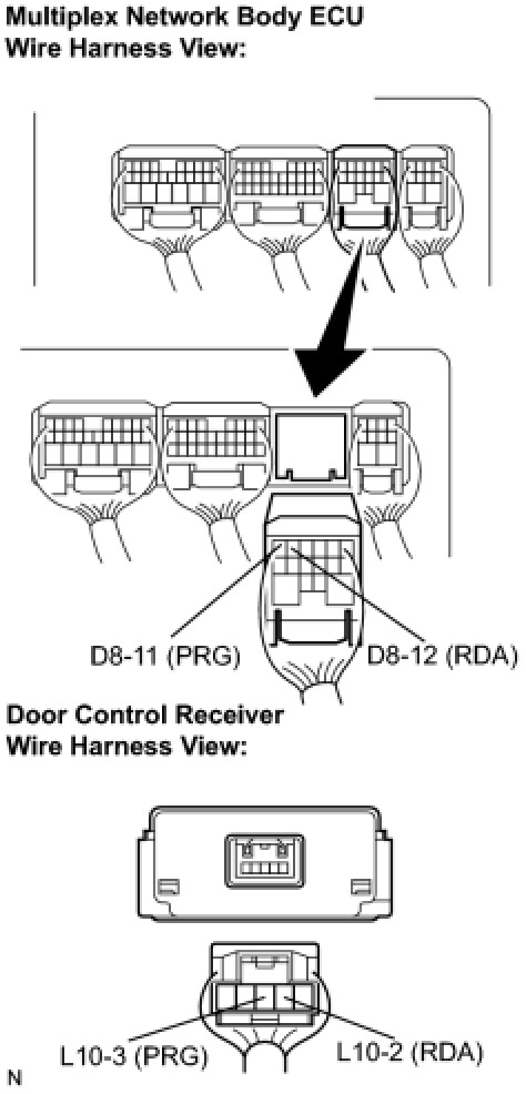 (a) Disconnect the multiplex network body ECU (D8) connector and the door control receiver connector.
