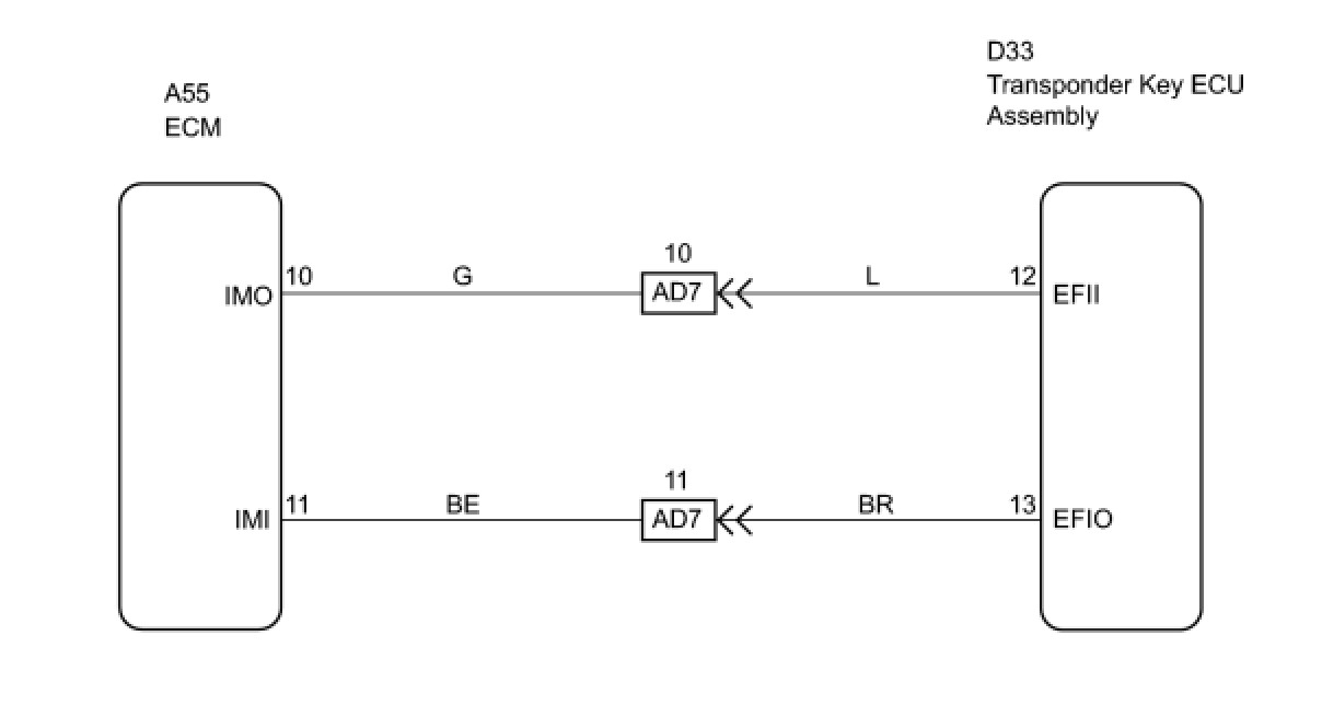 This DTC is stored when one of the following occurs: 1) the ECM detects errors in its own communications with the transponder key ECU assembly; 2) the ECM detects errors in the communication lines; or 3) the ECU communication ID between the transponder key ECU assembly and ECM is different when an engine start is attempted.