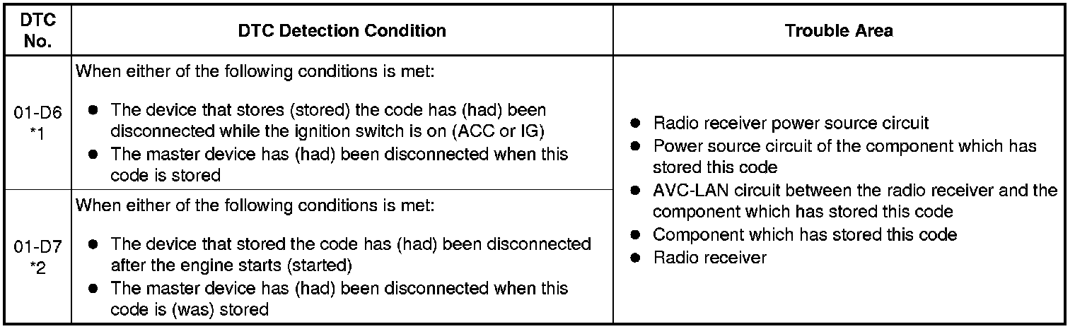 * *2: When 210 seconds have elapsed after disconnecting the power supply connector of the master component with the ignition switch on (ACC or IG), this code is stored.